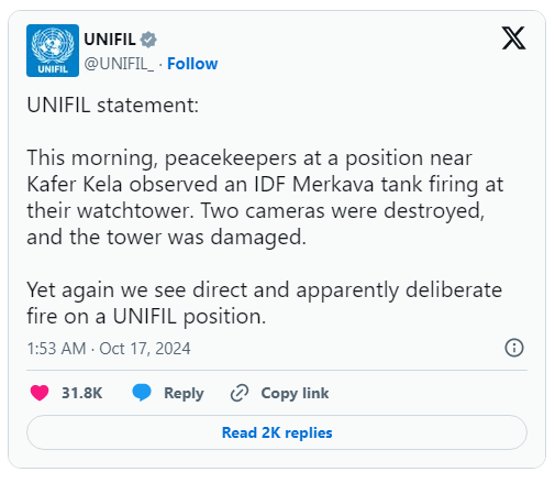 香港新聞網10月17日電 聯合國駐黎巴嫩維和部隊報告稱,當地時間16日淩晨,駐紮在黎巴嫩南部卡費爾凱拉地區附近的維和人員目擊到以色列國防軍的梅卡瓦坦克向觀察塔開火,導致兩臺攝像機被毀,觀察塔受損。 聯黎部隊在聲明中指出:“我們再次目睹了以色列國防軍對聯合國維和基地發動直接且明顯的蓄意襲擊。”聯黎部隊重申,以色列國防軍及所有相關方必須確保聯合國人員和財產的安全,尊重聯合國場所的不可侵犯性。