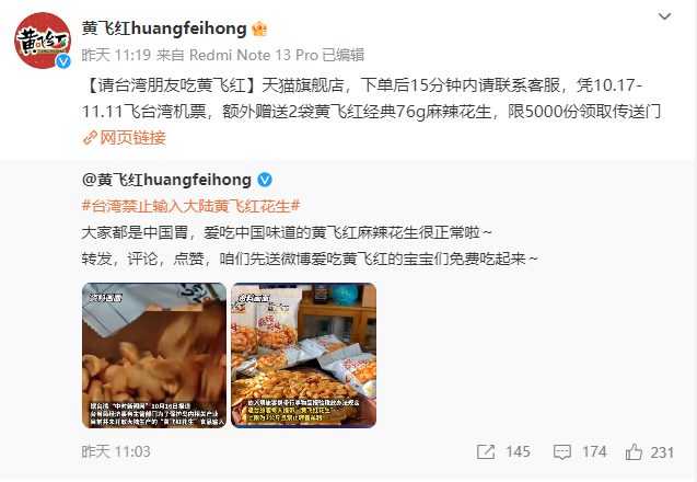 大陸人氣零食“黃飛紅花生”。(圖源:“黃飛紅”官方微博) 綜合台媒報道,高雄關10月16日發出新聞稿稱,大陸產“黃飛紅花生”屬於第2008.11.92.00-4號貨品,輸入規定MW0(大陸物品不準輸入)及F01(應向台灣衛生福利部門“食品藥物管理署”申請辦理輸入查驗)。 報道稱,台灣經濟部門“貿易署”為了保護島內相關產業,目前並未開放大陸產“黃飛紅花生”食品輸入,亦無項目核准案件。市面上販賣的“黃飛紅花生”屬非法輸入,已涉及違反有關法令,如果被查獲,除沒收貨品及罰款外,還將移送“貿易署”依相關條例裁處。 高雄關進一步說明,根據相關規定,返台旅客每人攜帶“黃飛紅花生”的上限為1公斤,且禁止轉售牟利。據了解,“黃飛紅花生”普遍的包裝是210克一包,換言之,一個人最多只能帶4包。 該消息傳到大陸後,“台禁止輸入大陸產黄飛紅花生”等話題迅速衝上微博熱搜,更有不少網友自發湧入“黃飛紅”直播間,開啟買買買模式。 針對相關禁令,“黃飛紅”官方旗艦店主播17日作出回應:因為當地為了保護自己的農產品,再加上他們做不出這個口味,所以採取了限制措施,產品沒有任何質量問題。 “黃飛紅”官方微博帳號也引用相關詞條,表示“大家都是中國胃,愛吃中國味道的黃飛紅麻辣花生很正常啦”,之後更發起一波活動,請台灣朋友吃“黃飛紅花生”。