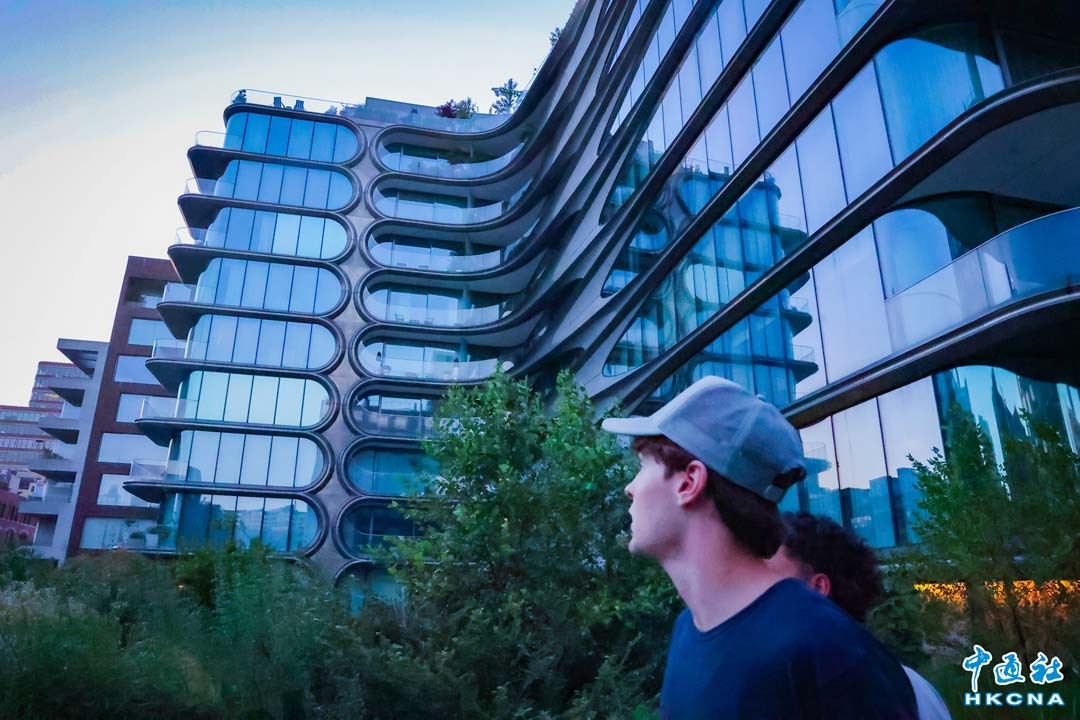 市民途經 Hudson Yards 廣場的曼哈頓巨型松果地標“Vessel”(右)(徐文峰 攝)