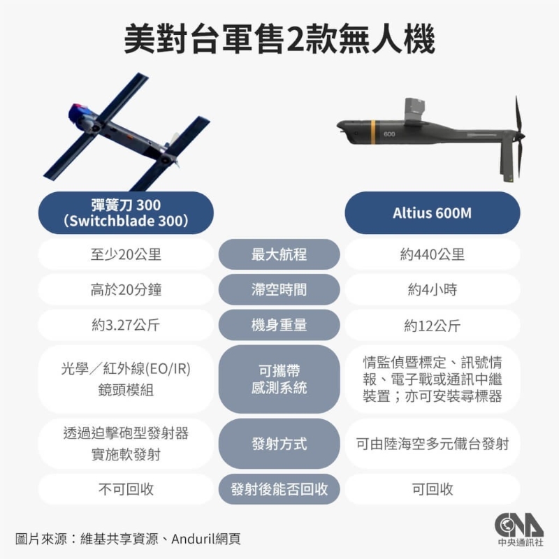 美售台兩款無人機參數。圖自台灣“中央社” 今年6月,美國國防安全合作署(DSCA)宣布,美國務院同意向台灣提供總價值約3.6億美元的“攻擊無人機導彈系統”,包含人員殺傷及反裝甲兩大類無人機。 其中,包括宇航環境公司的720架“彈簧刀300”型巡飛彈(俗稱自殺式無人機)與101套SB300射控系統,價值約6020萬美元;以及安杜里爾公司的291套“阿特斯”(ALTIUS)600M-V無人機系統,附帶可伸縮彈頭和光電/紅外(EO/IR)攝像頭模塊的巡飛彈,價值約3億美元。