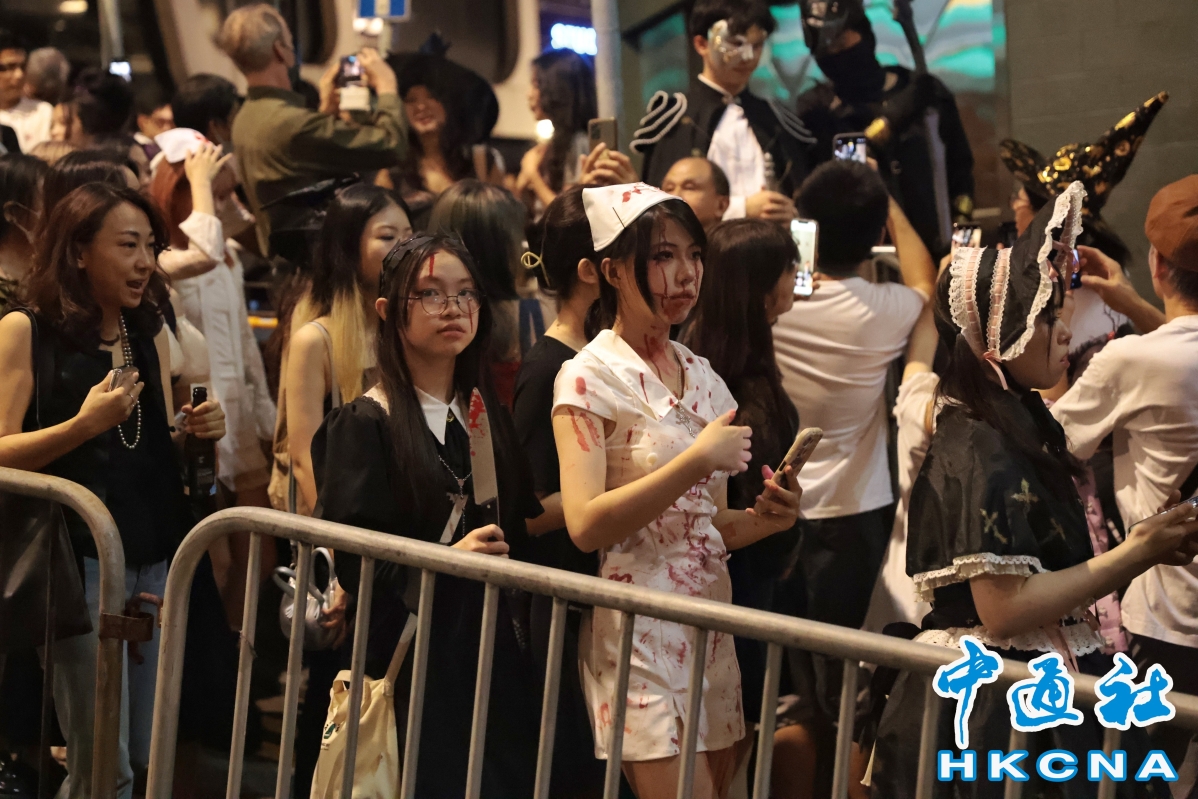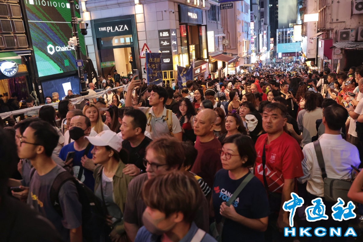 香港中通社图片(記者 謝光磊 攝) 萬聖夜的蘭桂坊,人流量有多誇張?中通社記者傍晚近7時實地探訪發現,窄窄的街道上,人流摩肩接踵,僅能龜速慢行。街兩旁有不少全副武裝的警察維護秩序,指揮人群在安全路線行走,防止過度擁擠。 “人太多了,都走不動路!”香港市民梁小姐下班後和朋友一起打扮來蘭桂坊過節,手裡還捧著文件夾,笑說這是最符合她今晚“打工族人設”的打扮。