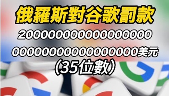 通說:谷歌被罰“200溝”,數字如世局最近幾天,俄羅斯和印度都因為一個數字,吸引了全球目光。 因美國谷歌公司旗下視頻平台YouTube關閉俄羅斯媒體賬戶,俄一家法院日前對谷歌處以罰款約20000000000000000000000000000000000美元。