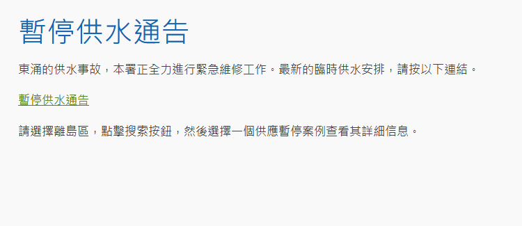 圖片來源:香港水務署官網 綜合港媒報道,清晨時分,東涌一帶仍然未恢復食水供應,水車在逸東邨善逸樓外待命,有居民一早來到取水,關愛隊成員在旁協助,亦有居民如常上班及上學。 水務署表示,事故涉及一條直徑1200毫米的食水管,東涌市一帶的食水供應昨晚10時起暫停。工程團隊進行緊急維修工作期間,水務署為受影響的居民和商戶安排臨時供水,包括水車及水箱等。 水務署說,會適時透過部門網頁及水務署流動應用程式,公布最新資訊。 署方亦表示,東涌一帶受影響的供水,預計明早陸續恢復,並感謝受影響居民及商戶的體諒。 受事故影響,翔東路近小蠔灣濾水廠對開的來回行車線須臨時封閉,以配合緊急維修工作。 附近居民指停水對生活影響不大。有東涌居民表示:“因為知道沒有水,昨晚都有提早一點儲水,早上小朋友吃麵都很快,弄一下就可以,不用太多水。(昨晚取的水夠用嗎?)沒有,不夠用,因為四個人,一家四口不夠用,都可以接受的,一次半次。”(完) 【編輯:紀東】