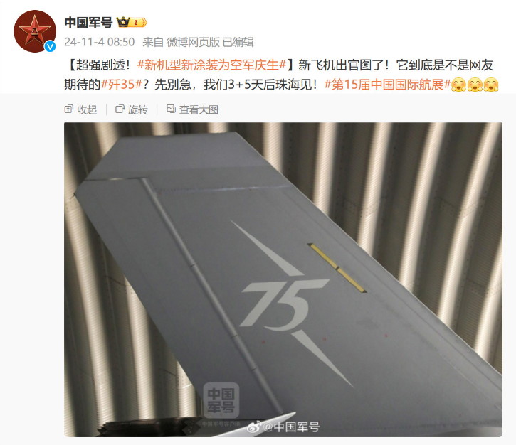 香港新聞網11月4日電 11月4日上午,@中國軍號發布的一則消息引發網友熱議。文案中寫道:“新飛機出官圖了!它到底是不是網友期待的殲35?先別急,我們3+5天后珠海見!”