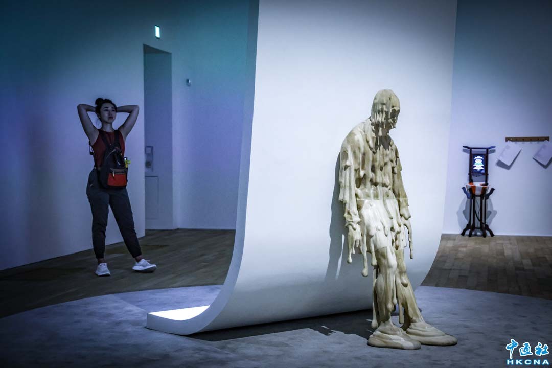 “荒丘”是藝術家陶輝在香港的首個美術館個展,於香港大館展出。除了多件最新委約的錄像裝置及雕塑作品外,展覽還涵蓋《辛苦》(2023)的亞洲首展,以及《四川到深圳》(2017)和《奔放》(2021)等近作。展覽糅合繪畫、雕塑、錄像、聲音、裝置和佈景設計等元素,著重展現陶輝如何以其荒誕卻寫實的藝術實踐來探索種種個體掙扎。(香港中通社記者 曹文毓攝)