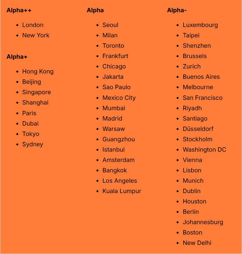 世界城市體系排名出爐 香港居前三香港新聞網11月5日電 世界城市體系排名日前出爐,香港排名穩居第三。粵港澳大灣區三個城市上榜Alpha(一線)。 "全球化與世界城市研究網絡"(GaWC)在其官網發佈了2024年的世界城市體系排名,這份榜單被認爲是全球最權威的世界城市排名之一。根據 GaWC 的說法,世界是一個以城市為中心的流動世界,Alpha 是非常重要的世界城市,將主要經濟區域和國家與世界經濟聯繫起來。 據該組織官網顯示,GaWC以其獨特視角對城市進行Alpha(一線城市),Beta(二線城市),Gamma(三線城市),Sufficiency(四線城市,自給自足城市)劃分,每個大的等級中又區分出多個帶加減號的次等級,以表明城市在全球化經濟中的位置及融入度。