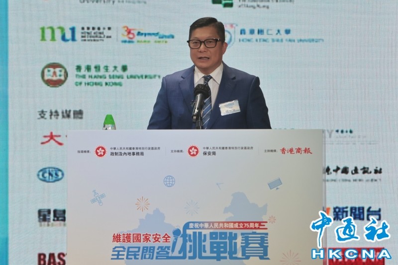 圖為香港特區政府保安局局長鄧炳強出席主禮並致辭。香港中通社圖片 香港特區政府保安局局長鄧炳強出席頒獎禮致辭表示,特區政府今年順利完成基本法第二十三條立法,與維護國家安全條例、香港改革互相銜接、兼容互補,為特區政府維護國家安全樹立起更加堅實的屏障。今次比賽,大大增強了市民維護國家安全的意識,如獲得冠軍的屯門官立中學歐天豪同學,用了短短23秒就答對全部題目。 鄧炳強表示,雖然香港已完成立法的憲制責任,但正如特首在施政報告中所講,國家安全的風險可以突如其來。市民不能掉以輕心,必須保持警惕;最重要的是加強國家安全教育、宣傳和推廣,形成“知法、守法、護法”的社會風氣。 香港商報常務副社長、執行總編輯藍岸致辭表示,國家安全不僅關乎國家的主權和發展,更與每一位公民的切身利益息息相關。本次比賽的每位參賽者都展現出了極高的積極性和專業性,凸顯對國家安全的關注和責任感。 是次比賽於9月1日開始至9月30日結束,主辦方開設專門的問答網頁,公開給予市民登入參與,並在全港媒體網站廣泛宣傳,吸引許多中學生參加比赛。挑戰賽共設4個獎項,冠軍可獲獎碟一枚及現金8000港元。 外交部駐港公署新聞及公共關係部副主任鄭莉萍,全國政協委員、港區婦聯代表聯誼會會長蔡黃玲玲等亦出席頒獎典禮並擔任主禮嘉賓。(完) 【編輯:淩玉輝】