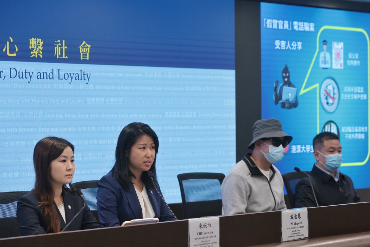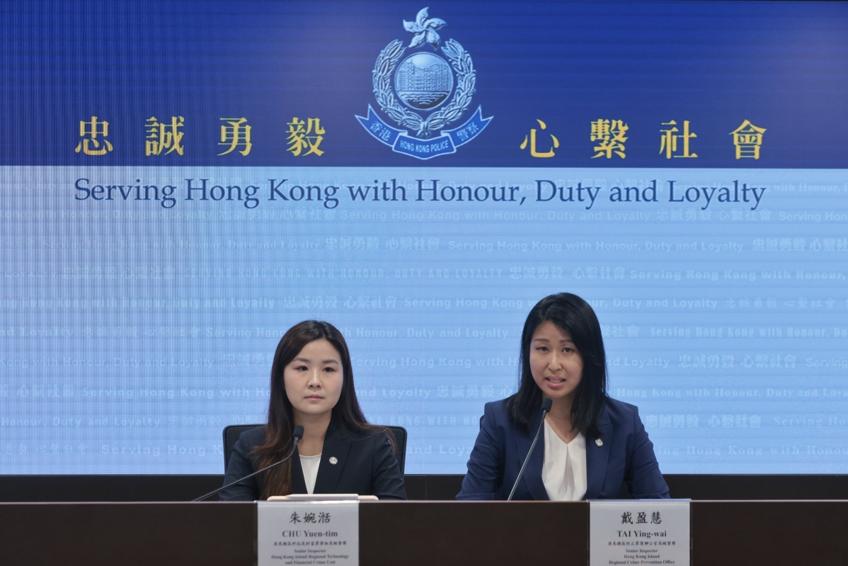 圖為港島總區科技及財富罪案組高級督察朱婉湉(左)及港島總區防止罪案辦公室高級督察戴盈慧出席記者會