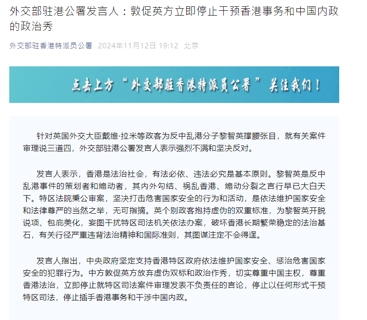 香港新聞網11月12日電 針對英國外交大臣戴維·拉米等政客為反中亂港分子黎智英撐腰張目,就有關案件審理說三道四,外交部駐港公署發言人12日表示強烈不滿和堅決反對。