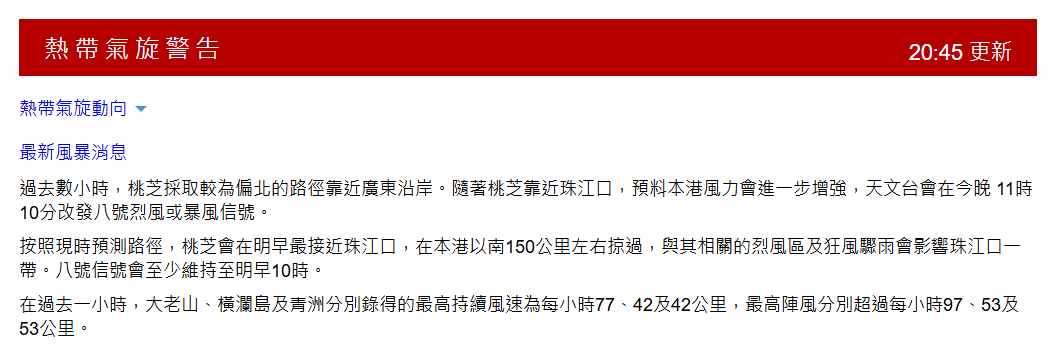 天文台表示,過去數小時,“桃芝”採取較為偏北的路徑靠近廣東沿岸。按照現時預測路徑,桃芝會在14日早上最接近珠江口,在香港以南150公里左右掠過,與其相關的烈風區及狂風驟雨會影響珠江口一帶。 在過去一小時,天文台於大老山錄得的最高持續風速為每小時59公里,最高陣風超過每小時87公里。 受颱風影響,香港所有上午校及全日制學校14日將停課,中小學的下午校及夜校上課安排將於14日公佈。特區政府民政事務總署已設立一條24小時緊急事故熱線2572 8427供市民查詢有關消息。(完) 【編輯:譚暢】