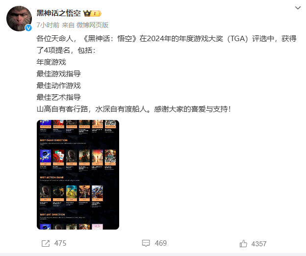 《黑神話:悟空》官方微博 《黑神話:悟空》官方微博發文回應,“山高自有客行路,水深自有渡船人。感謝大家的喜愛與支持! ” 《黑神話:悟空》發售已有近三個月,其在Steam平台的銷量再次創下新高,并進一步提升了銷售額。根據國外數據分析公司VG Insights的數據顯示,截至發稿時,《黑神話:悟空》在Steam平台的銷量已達2200萬份,并且該遊戲在Steam平台上的平均遊玩時間較之前的數據再次提升,達到了47.3小時。同時,其銷售額也已經超過10.1億美元(約合人民幣73.04億)。 需要注意的是,這2200萬份銷量僅針對Steam平台而言,在其他平台上的銷量數據尚未公佈。如果考慮到其他平台的銷量,《黑神話:悟空》的總銷量可能會更高。 同樣獲得年度遊戲提名的,還有《宇宙機器人》《小丑牌》《艾爾登法環:黃金樹幽影》《最終幻想VII:重生》《暗喻幻想:ReFantazio》等作品。 TGA是遊戲業最受關注和認可的獎項之一,今年TGA的最終評選結果預計將於北京時間12月13日揭曉。(完) 【編輯:紀東】