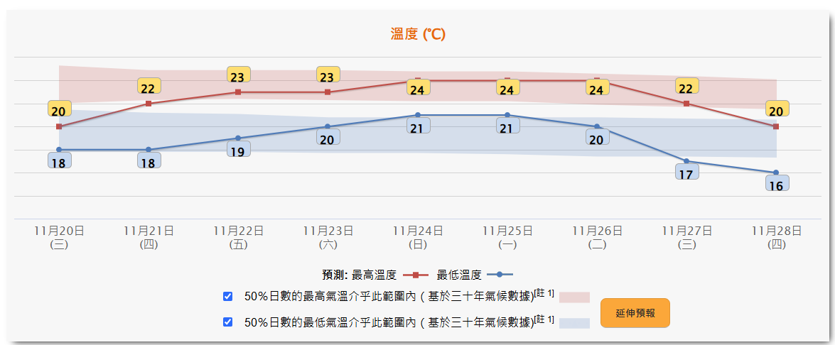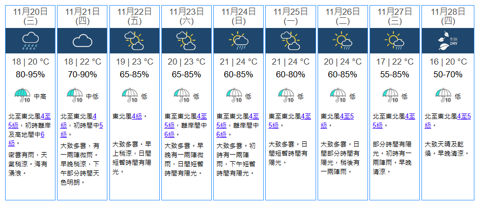 香港地區未來9天天氣預報。香港天文台截圖 香港地區今日(20日)天氣預測:密雲有雨,天氣稍涼。日間氣溫徘徊在20℃左右。吹和緩至清勁北至東北風,初時離岸及高地間中吹強風。海有湧浪。