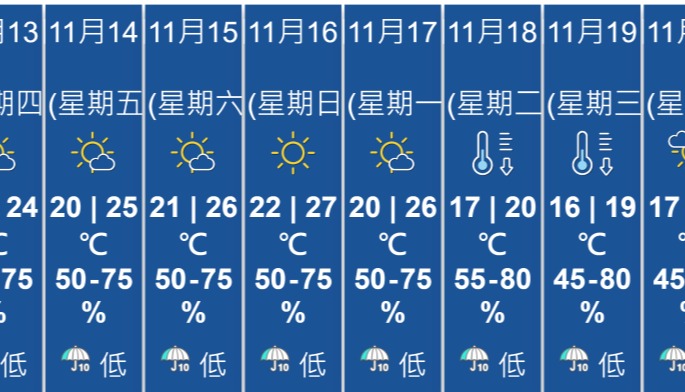 香港地區未來9天濕度預報。香港天文台截圖 未來天氣展望:未來一兩日早晚仍然稍涼,日間天色較為明朗。週末期間風勢頗大。(完) 【編輯:豐悅】