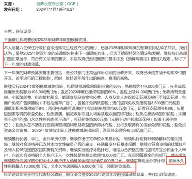 澳門特區政府官方網站截圖 澳門特區政府行政長官賀一誠昨日(19日)下午最後一次以特首身份,列席澳門立法會全體會議,介紹2025年度澳門財政安排。賀一誠宣布,2025年將繼續實施“現金分享計劃”,永久性居民每人獲發10000澳門元,非永久性居民每人6000澳門元,這也是澳門連續第18年向居民“派錢”。 賀一誠表示,他與第六任特首岑浩輝經過充分的商討,已就2025年財政年度的預算安排達成共識,認為雖然明年財政年度的施政報告將由下一屆政府作出,但為確保特區的穩定和發展、維持各公共部門的正常運作、符合有關法律的要求,本屆政府仍根據澳門基本法及《預算綱要法》的相關規定,訂立下一年度的財政預算。 現金分享計劃是2008年由時任澳門行政長官何厚鏵提出的,目的是分享經濟發展成果,抗擊通脹以及應對2008年金融危機的衝擊。2008年首次推行,累計發放17次(截至2024年),發放金額也有所提升。澳門市民普遍稱此計劃為“派錢”。(完)