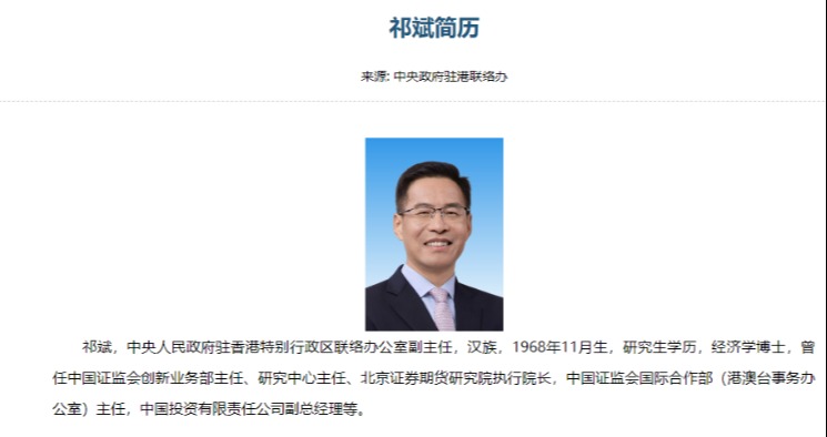 香港中通社11月25日電(香港中通社記者 陳卓儀)香港中聯辦副主任祁斌25日出席粵港澳大灣區上市公司高峰論壇,這是他以新的身份首次在香港亮相致辭。這位新任副主任備受關注,媒體報道他是中聯辦首位金融系統出身的主要官員。