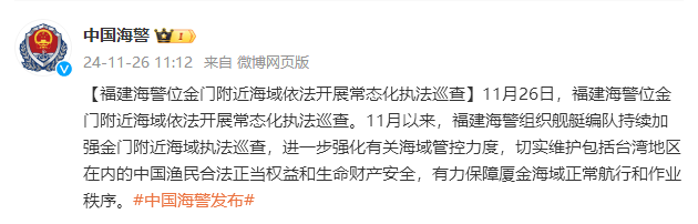 香港中通社11月26日電 據中國海警局26日消息,當日,福建海警位金門附近海域依法開展常態化執法巡查。