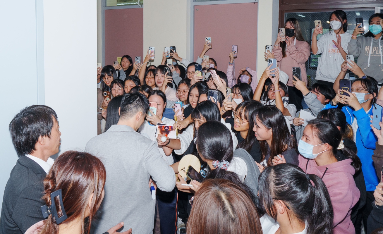 27日,大陸高校師生訪問團參訪台北市中山女子高級中學受到熱烈歡迎,馬龍為學生們簽名。(香港中通社圖片) 28日,行程第二天,訪問團上午來到台灣政治大學與該校師生進行交流。現場除了多家媒體外,大批同學也提早駐足等候,想要一睹冠軍風采。政大乒乓球隊的同學還舉起了“歡迎馬龍”的牌子,氛圍十分熱烈。不少學生看到馬龍、楊倩都相當興奮,還有人拿出球拍、衣服要簽名,馬龍也來者不拒。 有同學今天特意穿了“一身紅”,還帶了一件印有“中國”的T恤。他說,紅色除了搶眼、希望能够吸引到馬龍的注意之外,還有另一層意涵,“扎根在紅色大地上,希望兩岸可以多交流。”