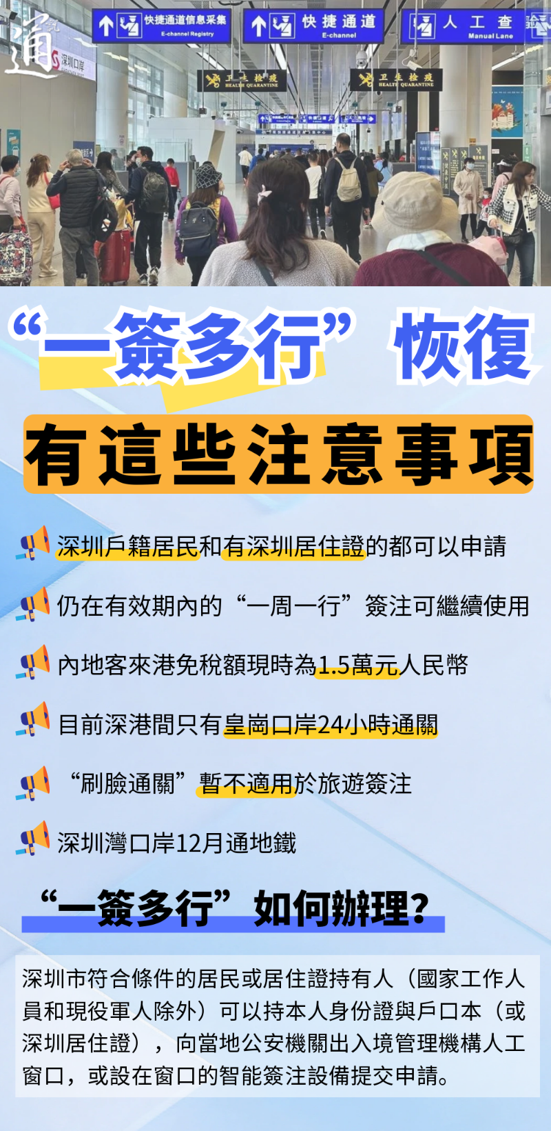 香港新聞網11月29日電 經中國國務院批准,中華人民共和國出入境管理局決定在廣東省深圳市實施赴香港旅遊“一簽多行”政策,自2024年12月1日起,深圳市戶籍居民和居住證持有人可以申請辦理赴香港旅遊“一簽多行”簽注,在1年內可不限次數往來香港地區,每次在香港逗留不超過7天。 此次恢復“一簽多行”實施,把“一簽多行”個人遊簽注擴展至持居住證的深圳市非戶籍居民,讓他們可以更方便自由訪港;同時,自2024年12月1日起,深圳市公安機關出入境管理機構不再受理赴香港“一周一行”簽注申請,已簽發的“一周一行”簽注仍在有效期內的可繼續使用。 一張圖看“一簽多行”注意事項↓↓