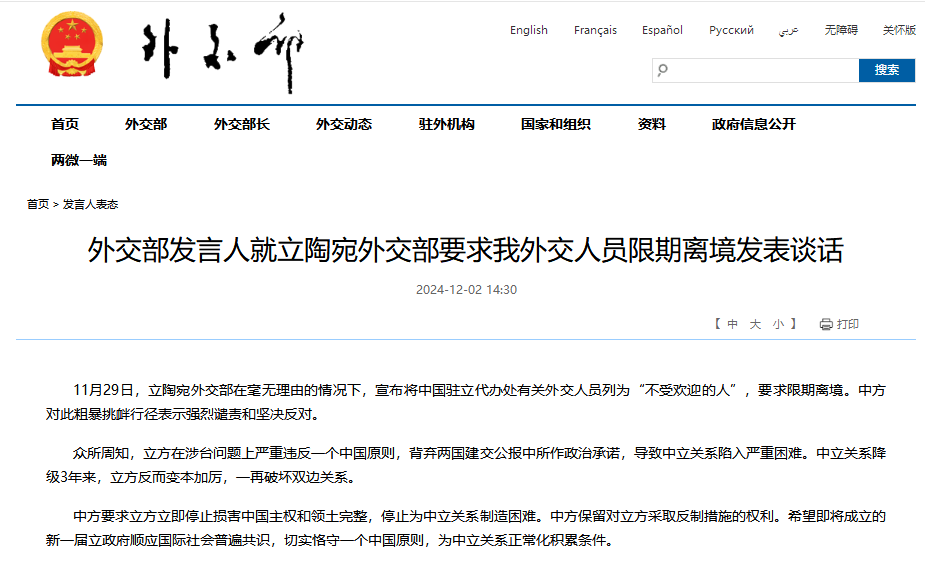 中國外交部網站截圖 11月29日,立陶宛外交部在毫無理由的情況下,宣布將中國駐立代辦處有關外交人員列為“不受歡迎的人”,要求限期離境。中方對此粗暴挑釁行徑表示強烈譴責和堅決反對。 中國外交部發言人指出,眾所周知,立方在涉台問題上嚴重違反一個中國原則,背棄兩國建交公報中所作政治承諾,導致中立關係陷入嚴重困難。中立關係降級3年來,立方反而變本加厲,一再破壞雙邊關係。 發言人表示,中方要求立方立即停止損害中國主權和領土完整,停止為中立關係製造困難。中方保留對立方採取反制措施的權利。希望即將成立的新一屆立政府順應國際社會普遍共識,切實恪守一個中國原則,為中立關係正常化積累條件。(完) 【編輯:丘志彬】