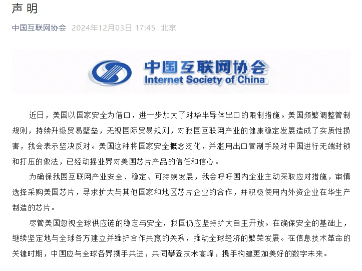 中國互聯網協會的聲明。公眾號截圖 中國互聯網協會發布聲明稱,為確保中國互聯網產業安全、穩定、可持續發展,協會呼籲國內企業主動採取應對措施,審慎選擇採購美國芯片,尋求擴大與其他國家和地區芯片企業的合作,並積極使用內外資企業在華生產製造的芯片。 中國半導體行業協會表示,在全球經濟一體化的今天,美國的單邊主義行為不僅損害了中美兩國企業的利益,也極大增加了全球半導體供應鏈成本。隨著美國出口管制措施不斷加碼,其反噬效應也在持續擴大,美國對華管制措施的隨意性對美國企業也造成了供應鏈中斷、運營成本上升等影響,影響了美國芯片產品的穩定供應,美國芯片產品不再安全、不再可靠,中國相關行業將不得不謹慎採購美國芯片。 中國汽車工業協會聲稱,美國政府隨意修改管制規則,嚴重影響了美國芯片產品的穩定供應,中國汽車行業對採購美國企業芯片產品的信任和信心正在被動搖,美國汽車芯片產品不再可靠、不再安全。為保障汽車產業鏈、供應鏈安全穩定,協會建議中國汽車企業謹慎採購美國芯片。 12月2日,美國宣布了新一輪對華出口限制措施,將140餘家中國企業加入貿易限制清單,涉及半導體製造設備、電子設計自動化工具等多個種類的半導體產品。(完) 【編輯:淩玉輝】