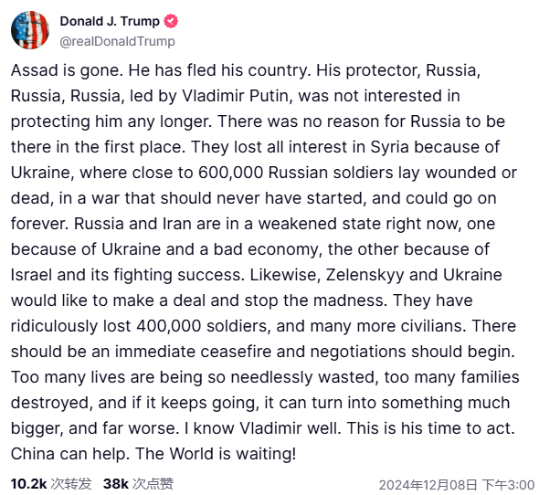 “真實社交”網站截圖 當日,特朗普在社交媒體上將敘利亞局勢與俄烏衝突相聯繫,稱由於俄烏衝突,俄羅斯對敘利亞完全失去了興趣,應該立即停火並開始談判。他稱,他很了解俄羅斯總統普京,現在是普京採取行動的時候了,中國也可以提供幫助。 有分析指出,特朗普並不關心敘利亞局勢,而是通過動蕩的敘利亞局勢來顯示俄羅斯的捉襟見肘,從而暗示俄烏談判的必要性,而特朗普的目光轉向了中國,顯得意味深長。 香港中觀研究所所長劉瀾昌9日對香港中通社表示,敘利亞如今的局面確實與俄羅斯陷入俄烏衝突無力聚焦中東問題有關,特朗普想藉機在俄烏停火問題上向俄羅斯施壓。而且,當前敘利亞局勢對於美國來說也未必有利,中東停火更加困難,國際形勢複雜化,這都是特朗普將面對的現實問題。在這種背景下,推動俄烏談判對特朗普來說有迫切性,但中東問題也分散了他的精力,如何推動俄烏談判對於特朗普而言並不容易,因此他希望將中國拉進來。 在發佈有關貼文之前,特朗普與法國總統馬克龍和烏克蘭總統澤連斯基舉行三方會晤,持續約35分鐘的會晤關注了俄烏衝突等“緊迫的全球問題”,但澤連斯基在最後約10分鐘才加入這次會晤。澤連斯基會後表示,這次會晤良好且富有成效。但他又指烏克蘭需要一個公正且持久的和平,沒有保障的停火隨時可能被重新點燃。 劉瀾昌說,目前俄烏比較容易做到就地停火,但這一停火也是脆弱的,尤其是領土等問題沒有被徹底解決。俄烏衝突的走向還是取決於美國和北約會否繼續支持烏克蘭打下去。 此外,特朗普多次批評美國總統拜登處理俄烏衝突的方式,還曾多次表示他能在一天內解決衝突,但近日他卻一改口風。據報道,在一個視頻採訪中,當被追問有關問題時,特朗普顯得有些沮喪。 劉瀾昌認為,特朗普很難迅速解決俄烏衝突,尤其是在敘利亞政局變動的情況下。儘管當前俄羅斯面對一定壓力,但俄方可能也會認為俄羅斯在中東的影響力受到影響,而需要在俄烏衝突上取得更多戰果。(完) 【編輯:淩玉輝】