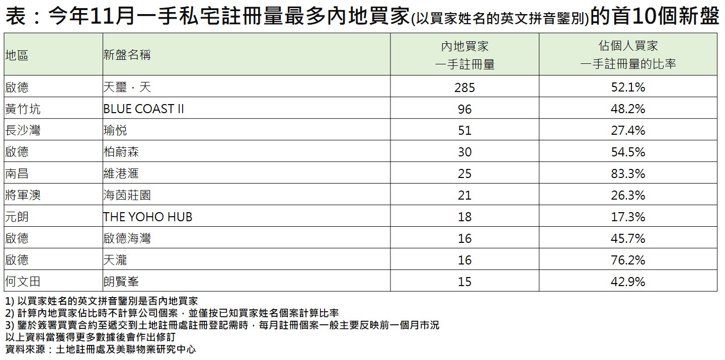 (圖源:美聯物業) 若按不同金額劃分,交易價值越大,中國內地買家佔比越大。11月份已知個人買家的逾5000萬元(港幣,下同)一二手住宅註冊量中,內地買家(以買家姓名的英文拼音鑒別)佔比高達74.2%;逾2000萬至5000萬元的個人買家中,內地買家亦佔約58.2%;至於1000萬元或以下的中低價物業,內地買家佔比約21.7%,略低於整體約26.6%的水平。 以11月一手私宅註冊量最多內地買家(以買家姓名的英文拼音鑒別)的首10個新盤計算,港島黃竹坑及新界元朗各佔1個,餘下8個均在九龍區。值得留意的是,九龍區之中,4個更處啟德區,可見該區一手市場深受內地買家歡迎,當中新地旗下的啟德天璽.天更以285宗註冊登記成為11月最多內地買家選購的新盤,佔個人買家比率亦達52.1%。 黃竹坑的BLUE COAST II為內地買家選購第二多的新盤,於11月錄96宗內地買家註冊登記,亦是唯一一個躋身10大的港島區物業;內地買家選購第三多的是長沙灣瑜悅,錄51宗內地買家註冊登記,佔比則有27.4%。 Google 10日公布香港2024年度搜尋榜,包括2024年度熱搜新盤。或因受內地買家青睞,天璽.天、Blue Coast、柏蔚森、瑜悅、朗賢峯等均位列10大熱搜新盤。 Google香港2024年度熱搜新盤 1. 泰峯 2. 柏蔚森 3. Belgravia Place 4. 天璽.天 5. Blue Coast 6. 朗賢峯 7. 瑜悅 8. 黃金海灣.意嵐 9. 薈鳴 10. 麗玥苑 (完) 【編輯:劉春】