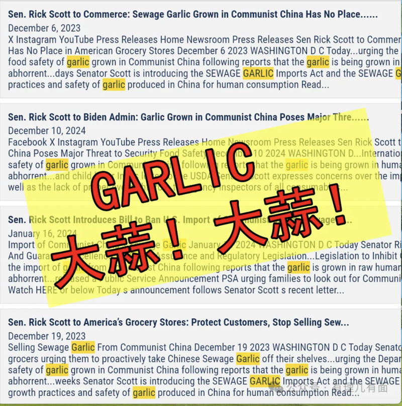 圖片來源:新華網 出於所謂“農業安全和反競爭方面的擔憂”,法案禁止在美國軍營銷售來自中國的新鮮或冷藏的大蒜。 這可不是個例。就在法案在眾議院通過的前一天,美國佛羅里達州共和黨籍參議員里克·斯科特(Rick Scott)的辦公室剛剛發布了一份聲明。聲稱中稱,中國種植的大蒜對美國的食品安全構成“極大威脅”,希望多個聯邦機構能夠調查美國進口的中國大蒜。 在這份聲明中,無辜的中國大蒜被形容為是“在污水中生長,在令人發指的條件下被漂白、收割”的“不良食品”,還被扣上“生產過程中往往涉及奴隸和童工”的“罪行”。 大到是危害國家安全,小到危害個人健康,反正有人要讓中國大蒜在美國待不下去。 事實上,這並不是大蒜第一次被盯上。斯科特是美國鼎鼎大名的“中國大蒜天敵”,從2023年起他便和中國大蒜過不去。不僅提出一系列“反對中國大蒜”的議案,還不斷給各部門寫信投訴“中國大蒜”,甚至跑到雜貨鋪,要求店鋪停止銷售中國大蒜。 10個月前,他在自己的海外社交媒體賬號上發布了一條抹黑中國大蒜的視頻,其本人親自出鏡,還發表了那番著名的“大蒜危害論”,稱有被迫剝蒜的“奴隸”因此指甲都掉光了,不得不用牙咬蒜。 大蒜無言,有中國的標籤,就是罪。大蒜很輕,因為來自中國,就背上了許多沈甸甸的政治話術大帽子。 這一系列啼笑皆非的行為背後,斯科特或者說美國一群政客的用意是什麼?或許在他給美國貿易代表的信中可見端倪。他說,中國大蒜損害了美國農民的利益,破壞了我們農業供應鏈的完整性,危及美國大蒜產業,威脅美國糧食安全。 中國的產品,再次因為“物美價廉”而無辜受害。