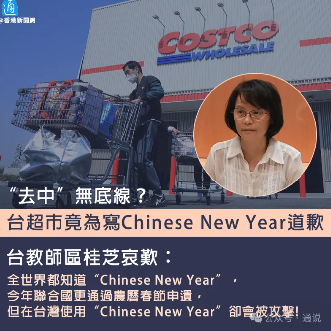 農曆新年將至,台灣零售商Costco販賣的年菜因標示“Chinese New Year”而遭台籍網紅投訴,之後Costco快速將標示改為“Lunar New Year”,引發台灣輿論不滿。 對此,台北市第一女子高級中學教師區桂芝哀嘆,全世界都知道“Chinese New Year”,今年聯合國更通過農曆春節申遺,但在台灣,使用“Chinese New Year”卻會被攻擊。 台籍網紅“盤穀唯一勸世吵架王”日前在社交平台臉書專頁發文稱,他發現Costco最近在官方網站上開始販賣年菜組合,但英文介紹卻寫著“Chinese New Year”,所以他寄信給Costco,稱新年不是隻有中國在過,所以Costco“更應該考慮到用字精準的重要性”。 該網紅“炫耀”,寄出信件後不到7個小時,就發現Costco官網原本寫著的“Chinese New Year”被改為“Lunar New Year”(農曆新年)。