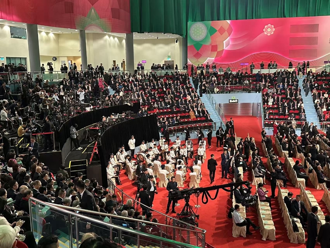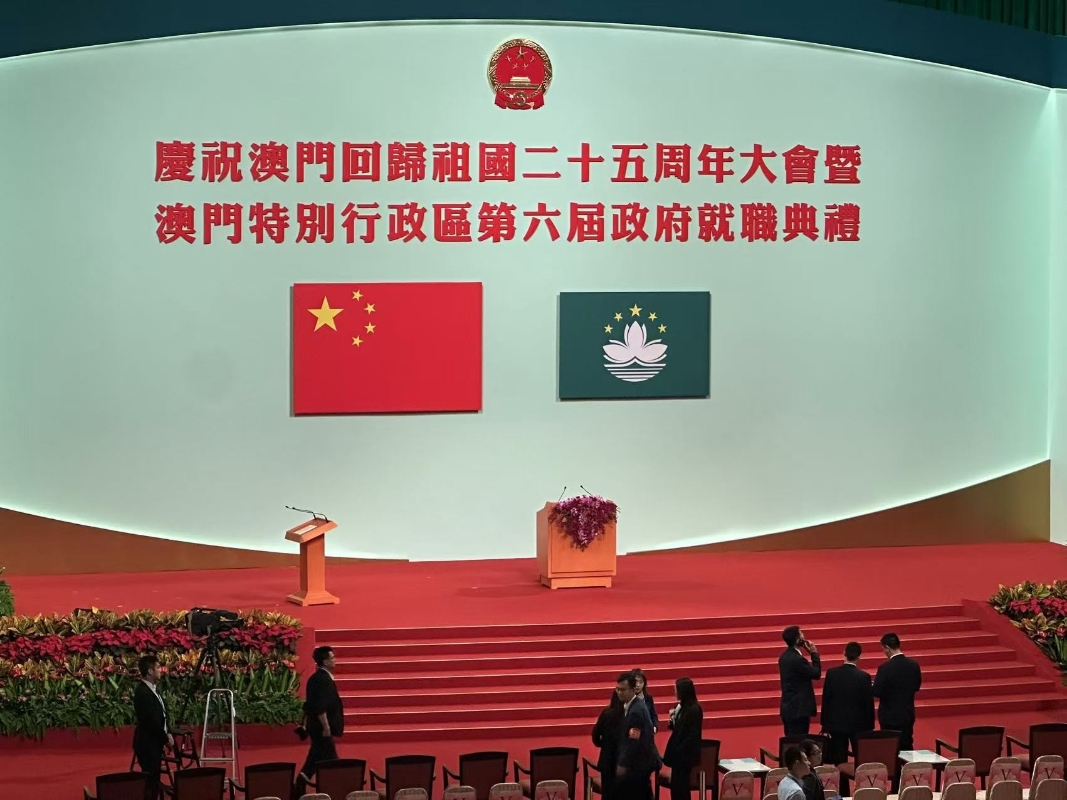 香港中通社圖片 就職典禮現場以澳門主題墨綠色佈置,與漸變的紅色交相輝映,呈現莊重氛圍。奶油色的背景板高掛國徽、國旗、區旗,成為嘉賓的最佳“打卡位”。