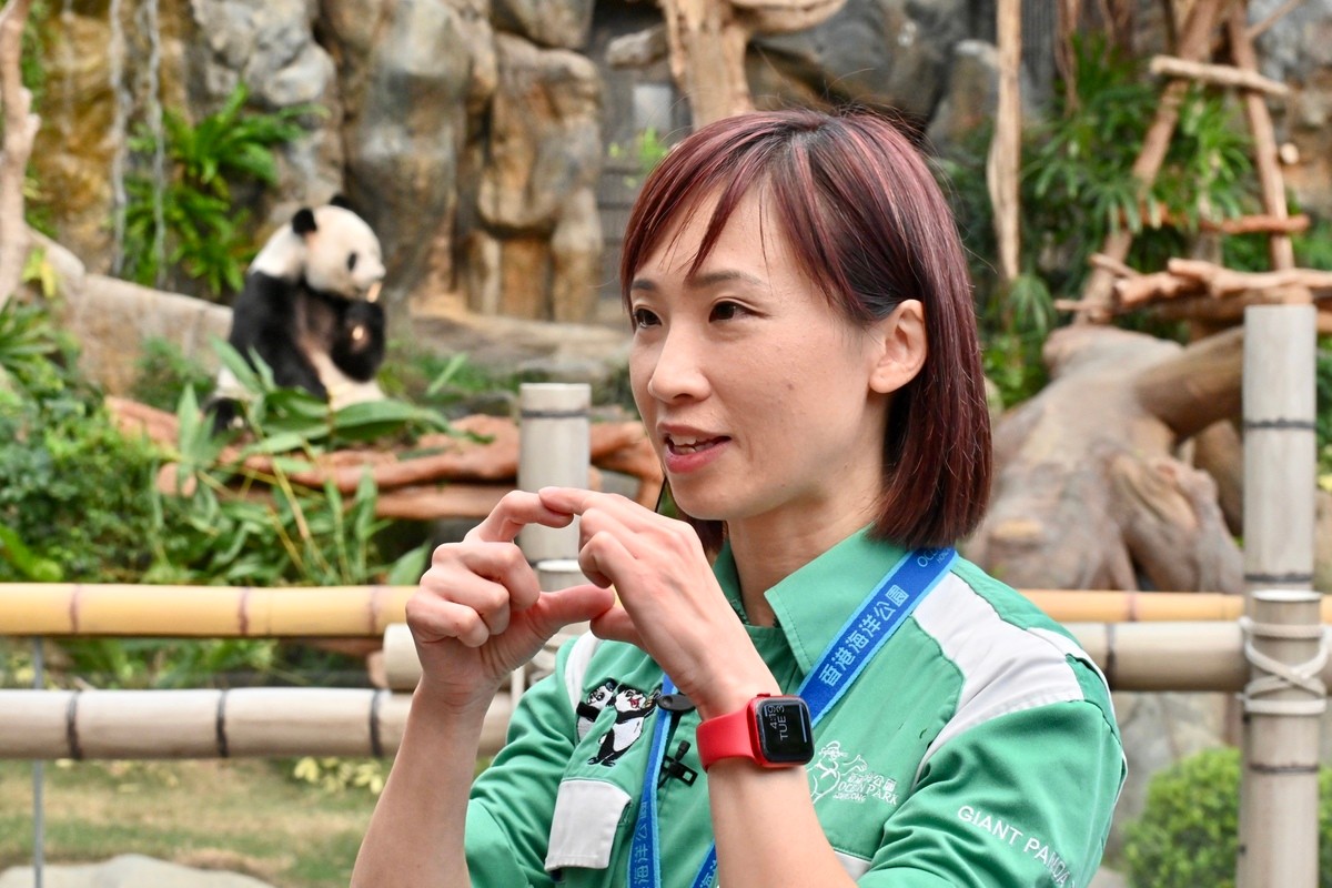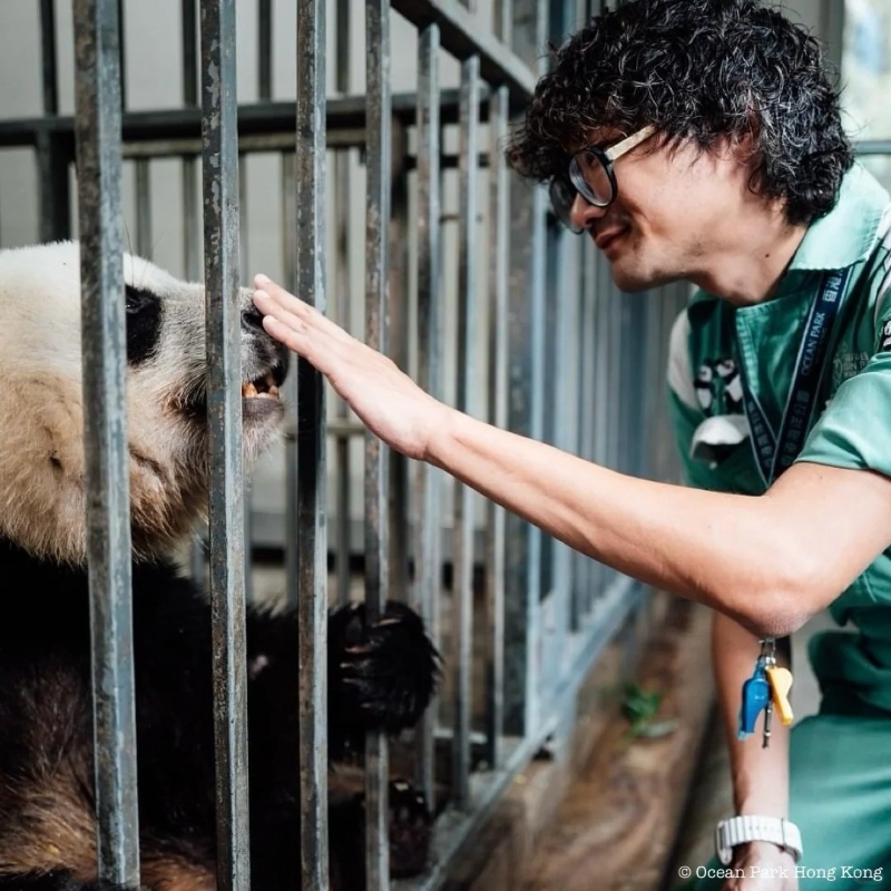 護理員鄧巧賢以針筒輕觸新來港的“安安”的手臂,讓牠熟習抽血過程。(圖源:政府新聞網) 海洋公園的護理團隊中,資深護理員胡綺琪是一位經驗豐富的“熊貓奶媽”,她自2007年起便與大熊貓結下了深厚的緣分。在她17年的工作中,無論是已離世的初代居港大熊貓“安安”和“佳佳”,還是後來的“樂樂”、“盈盈”,以及今年出生的龍鳳胎“家姐”和“細佬”,都曾受到她的精心照料。她回憶起剛入職時與“佳佳”建立關係的過程,這隻曾在野外出生、年幼時被救助的大熊貓起初對人類十分戒備,但在她長期的悉心照顧下,最終主動靠近,甚至願意讓她幫忙抓背。胡綺琪笑著回憶:“‘佳佳’是四隻大熊貓(指安安、佳佳、盈盈和樂樂)裡最有性格的,很認自己的護理員,一開始不會跟你親近。但有一天,牠突然靠近我,背過身坐下,讓我幫牠抓背。”這樣的瞬間讓她深受感動,也讓她更加堅定了照顧動物的初心。