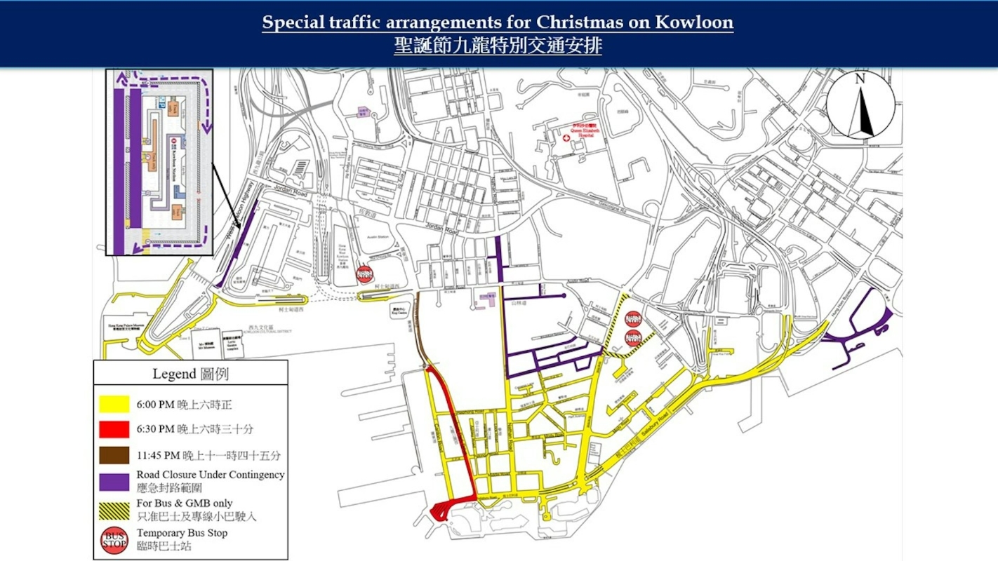 香港九龍地區聖誕節特別交通安排。香港特區政府新聞處圖 九龍方面,警方亦會分3階段封路。24日下午6時起,西九文化區博物館道、尖沙咀彌敦道等會率先封路。晚上6時半起,梳士巴利道也會封路。24日晚上11時45分起,介乎柯士甸道與九龍公園徑的廣東道亦將封閉。警方指,如有需要,會在封閉其他道路。