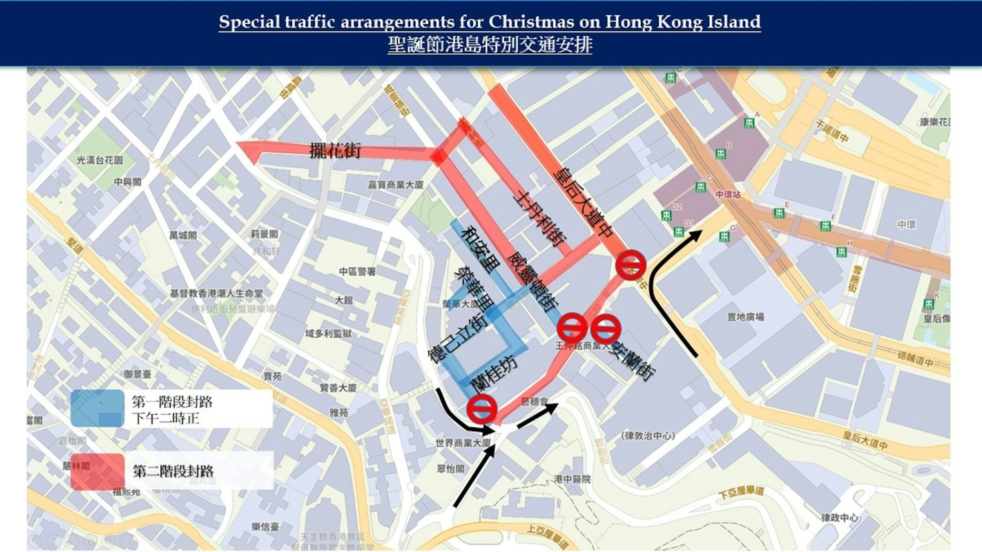 香港港島地區聖誕節特別交通安排。香港特區政府新聞處圖 中環方面,香港警方指24日下午2時至25日上午5時,中環下列路段將率先封閉。 *介乎雲鹹街與威靈頓街的德己立街 * 蘭桂坊 * 榮華里 * 和安里 * 介乎雲咸街與德己立街的威靈頓街 *安蘭街 其他路段如擺花街、閣麟街等則視乎人潮情況,再考慮封閉。