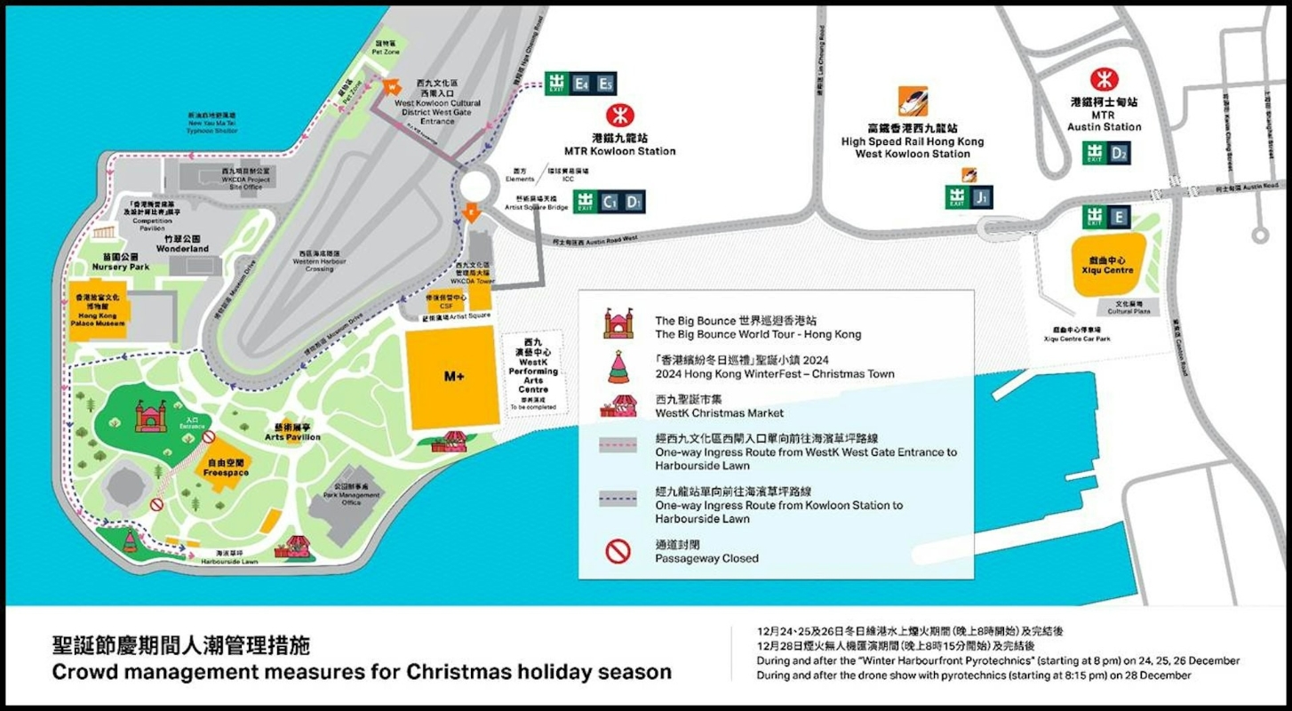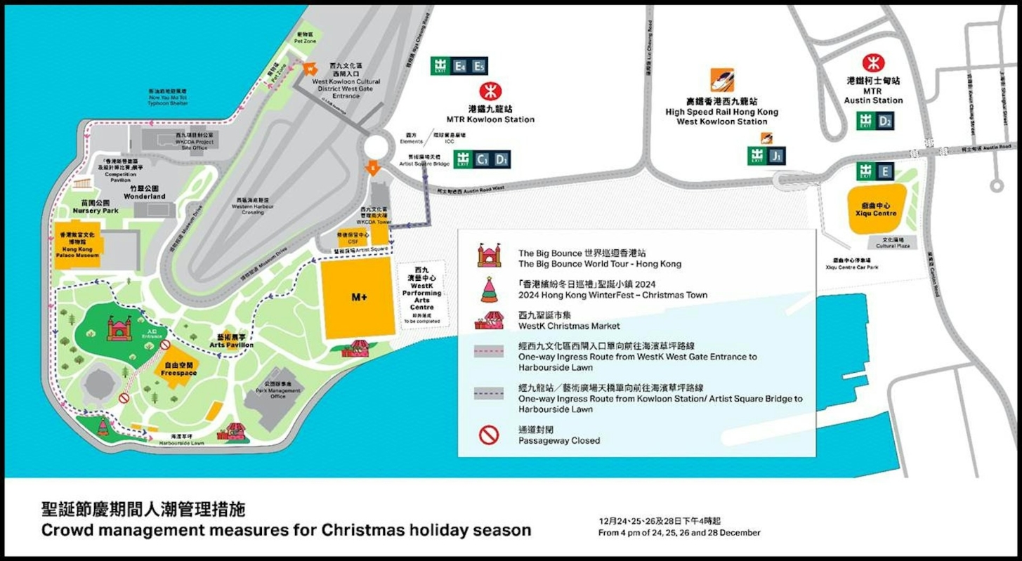 香港西九文化區聖誕節假期期間人潮管理措施:12月24、25、26及28日下午4時起。香港西九文化區圖