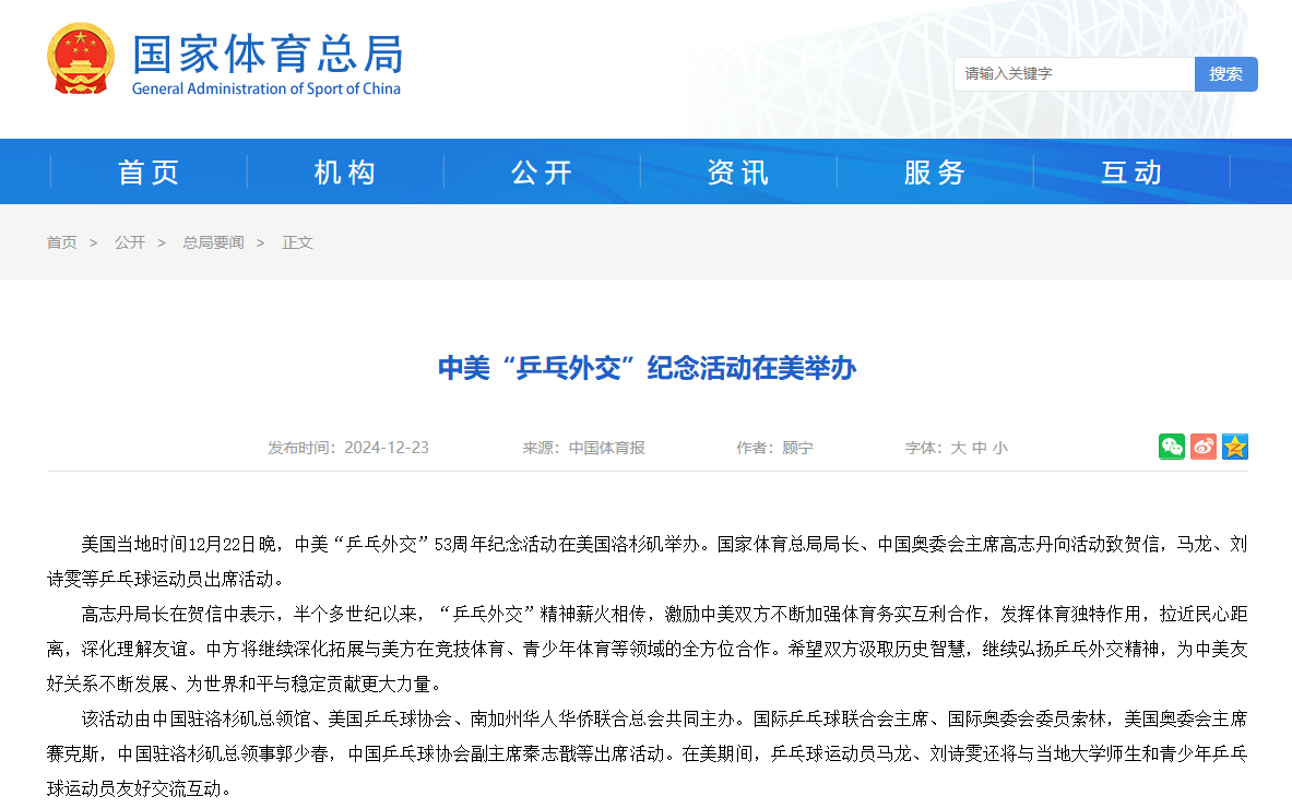 中國國家體育總局官網截圖 美國奧委會主席賽克斯等與會嘉賓回顧了“乒乓外交”歷史,肯定這一“非凡事件”對推動美中關係發展的獨特作用,表示“乒乓外交”精神至今仍具有重要影響力,將繼續塑造雙邊關係,激勵人們創造更加和諧的世界。 當晚還舉行了中美乒乓球隊交換隊服儀式,大會又向美國乒乓球國家隊前隊員、“乒乓外交”親歷者戴爾·斯威里斯和康妮·斯威里斯與馬龍、劉詩雯頒發外交貢獻獎,兩位運動員還即興組成混雙組合一展球技。在美期間,馬龍、劉詩雯還與當地大學師生和青少年乒乓球運動員進行友好交流互動。(完) 【編輯:丘志彬】