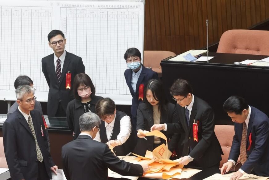台灣立法機構工作人員在計票。台灣“中央社”圖片 台司法機構共設立“大法官”15席,扣除任期已屆滿的,現行“大法官”僅8位。台當局領導人賴清德今年8月提名7位新任“大法官”人選,其中張文貞出任“正院長”,姚立明出任“副院長”,另外5位為何賴傑、陳運財、王碧芳、廖福特與劉靜怡。 台司法機構“大法官”人事案當天上午在立法機構進行投票表決。目前立委總數為113席,需要至少獲得過半數的57張同意票,提名才為通過。 中國國民黨立委連同親藍營的2席無黨籍立委對7位“大法官”被提名人全部投下不同意票;台灣民眾黨立委封殺6人,僅對劉靜怡投同意票;民進黨立委則同意其他6人,唯獨反對劉靜怡。因此7位“大法官”被提名人全數被否決。 值得注意的是,民進黨反對劉靜怡的提名,是史上首次執政黨立委否決同黨籍領導人提名的人選。且有別於個別立委跑票,這一次是執政黨黨鞭率立委集體投下反對票。 民進黨立法機構黨團總召柯建銘稱,劉靜怡過去一直批評民進黨,昔日多次質疑蔡英文博士論文,還痛批民進黨立委王義川“愚蠢”。因此黨團決議一致投票反對。事前已向賴清德致電,解釋是“黨團自主”,賴清德也對此表達尊重。 國民黨團總召傅崐萁表示,朝野立委同心協力,全數否決賴清德所提人選,形同對賴清德投下不信任票。 民眾黨團稱,劉靜怡被提名後,仍勇於對敏感議題作出表態,展現超出黨派的態度,相較其他被提名人更具資格,卻遭民進黨黨意封殺。今天投票結果,更是民進黨立委對賴清德的不信任投票。 台立法機構日前三讀通過“憲法訴訟法”修正草案,規定“憲法法庭”參與評議的“大法官”人數不得少於10人;作成“違憲”宣告時,同意“違憲”宣告的“大法官”人數不得少於9人。由於本次“大法官”人事案全數未通過,現行“大法官”人數維持在8人,賴清德必須重新提名,提名通過前“憲法法庭”將持續停擺,並無法宣告“違憲”。 台灣《聯合報》發表評論指出,“大法官”人事同意權非同小可,但賴清德提名如同兒戲,執政黨立委投下反對票更是政壇大事,形同“集體造反”,對當局投下不信任票,也讓賴清德威信掃地。不論民進黨決策高層如何應對茶壺風暴,都預示著未來賴清德的執政將難上加難,台灣政治動盪將雪上加霜。(完) 【編輯:淩玉輝】