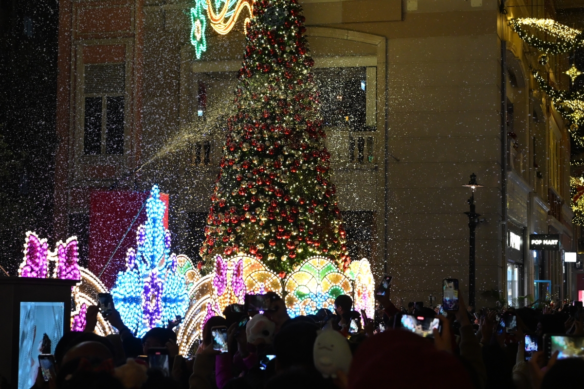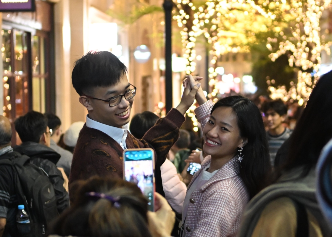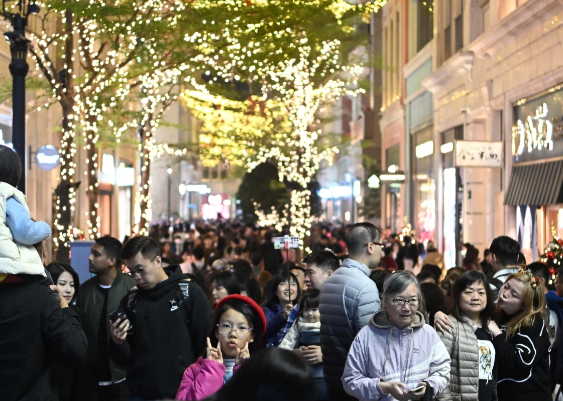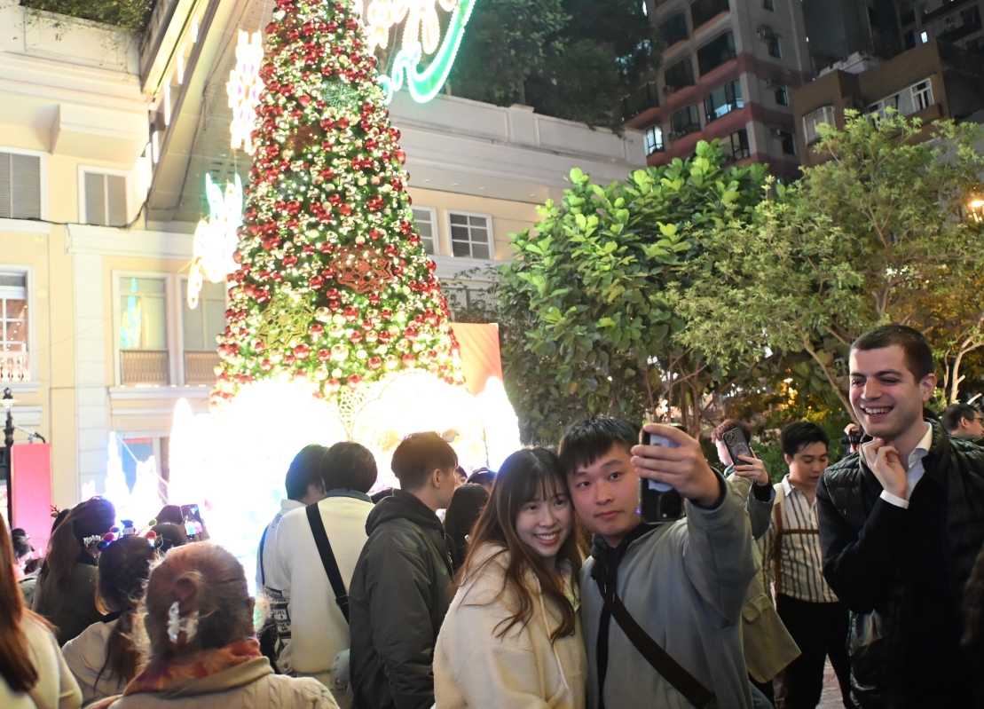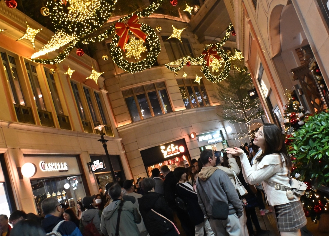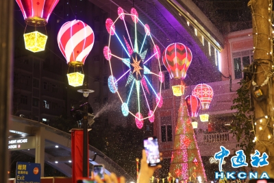 香港新聞網12月24日電(記者洪少葵)12月24日晚,香港灣仔地標利東街迎來人山人海的市民和遊客。長達27米的幻影雪鹿蕾絲燈光裝置,象征幸褔的馴鹿,周圍環繞著夢幻的雪花圖案,讓人們置身歐陸風情之中。 矗立於中庭的 8 米高“蕾絲裝飾聖誕樹”,樹身上懸掛著逾千個聖誕裝飾,蕾絲聖誕球與各式閃爍的蕾絲掛飾互相輝映,絢麗奪目。街道上不定時的戶外飄雪更是令人歡喜不已。灣仔和銅鑼灣商圈洋溢著濃厚的節日氣氛。