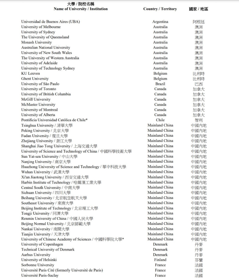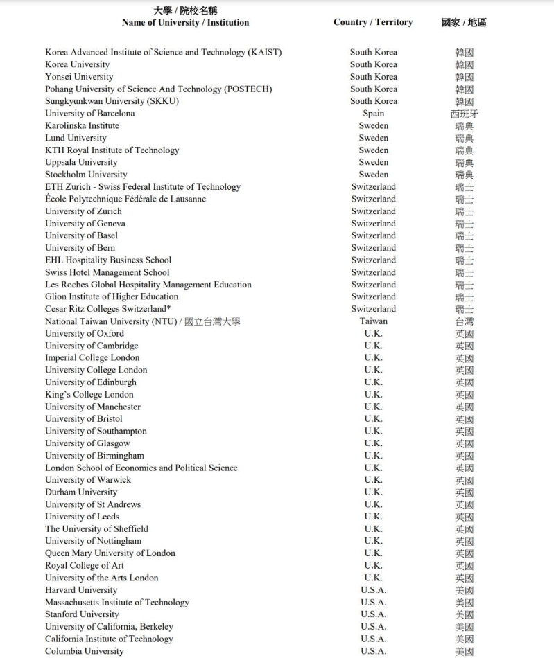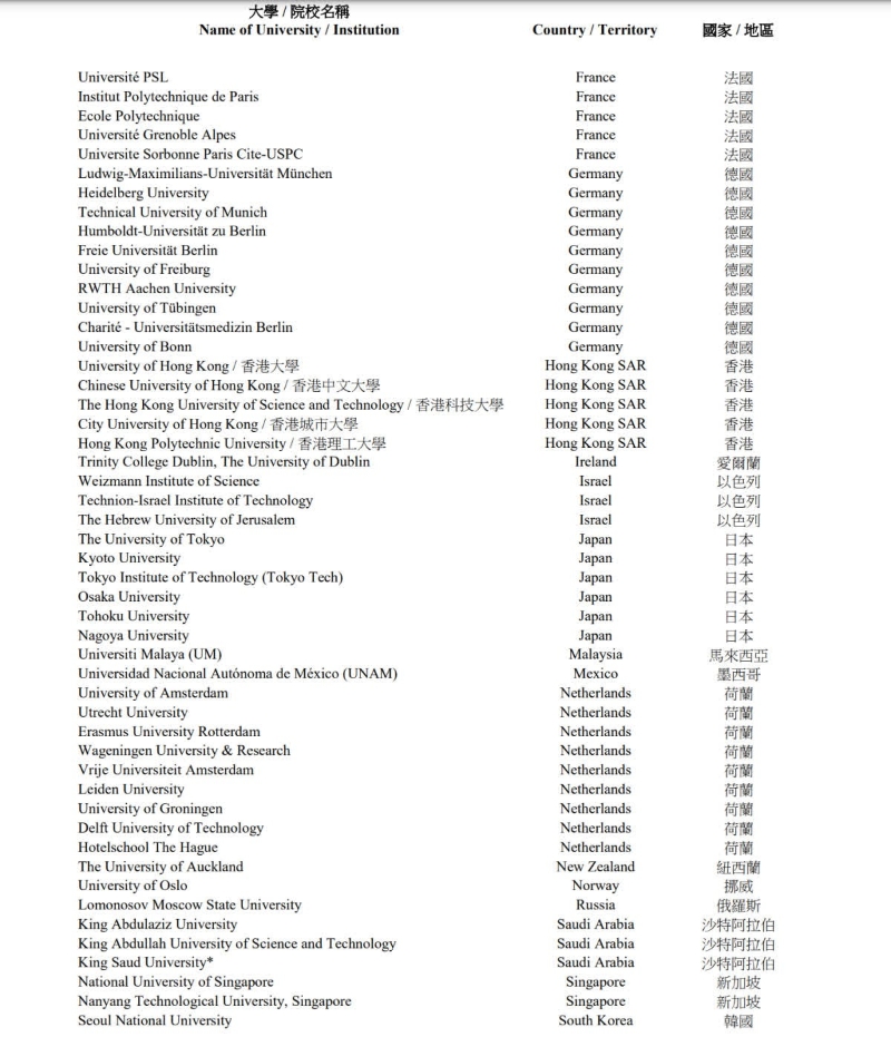高才通計劃經年度更新的合資格大學綜合名單。香港特區政府新聞處 高才通計劃旨在吸引下列三類人才: A類:在緊接申請前一年,全年收入達港幣250萬元或以上的人士; B類:獲綜合名單中的大學/院校(合資格大學/院校)頒授全日制學士課程學位、並在緊接申請前五年內累積至少三年工作經驗的人士;或 C類:在緊接申請前五年內,獲合資格大學/院校頒授全日制學士課程學位,但工作經驗少於三年的人士。 今次綜合名單的更新反映四個世界大學排行榜(即泰晤士高等教育世界大學排名、Quacquarelli Symonds(QS)世界大學排名、美國新聞與世界報道全球最佳大學排名及上海交通大學世界大學學術排名)過去五年所列的百強大學/院校;以及過去五年在QS世界大學排名“酒店及休閒管理”範疇位列前五名專門提供酒店課程的大學/院校於2024年的變動。 另外,自今年11月1日起,綜合名單亦包括過去五年在QS世界大學排名“藝術與設計”範疇位列前五名的專科學院,以及過去五年於《上海交通大學中國大學排名》位列首20名的內地大學。 經更新的綜合名單將涵蓋199間合資格大學/院校,並將於2025年1月1日上載至香港人才服務辦公室線上平台(點擊跳轉)和入境事務處高才通計劃網頁(點擊跳轉)。(完) 【編輯:豐悅】