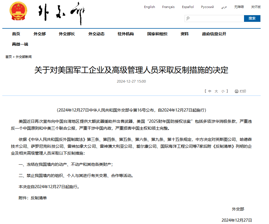 中國外交部網站截圖 中國外交部表示,美國近日再次宣布向中國台灣地區提供大額武器援助并出售武器,美國“2025財年國防授權法案”包括多項涉華消極條款,嚴重違反一個中國原則和中美三個聯合公報,嚴重干涉中國內政,嚴重損害中國主權和領土完整。 依據《中華人民共和國反外國制裁法》第三條、第四條、第五條、第六條、第九條、第十五條規定,中方決定對英斯圖公司、哈德森技術公司、薩羅尼克科技公司、雷神加拿大公司、雷神澳大利亞公司、愛爾康公司、國際海洋工程公司等7家企業及相關高級管理人員採取反制措施:凍結在中國國境內的動產、不動產和其他各類財產;禁止中國境內的組織、個人與其進行有關交易、合作等活動。 決定自2024年12月27日起施行。 (完) 【編輯:丘志彬】