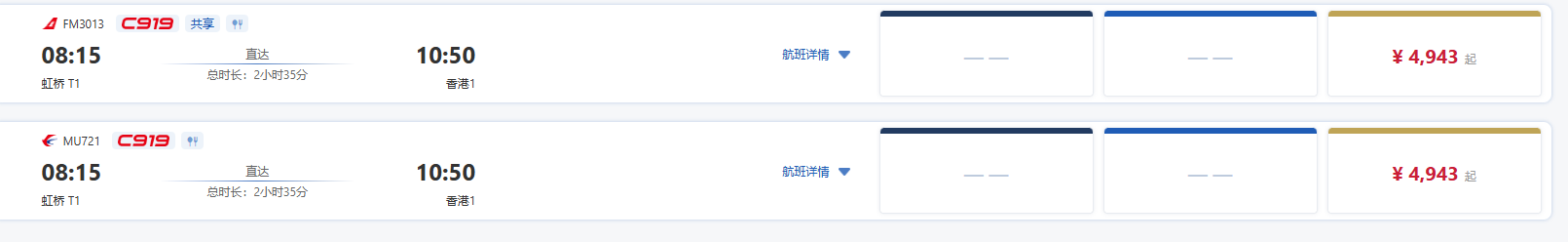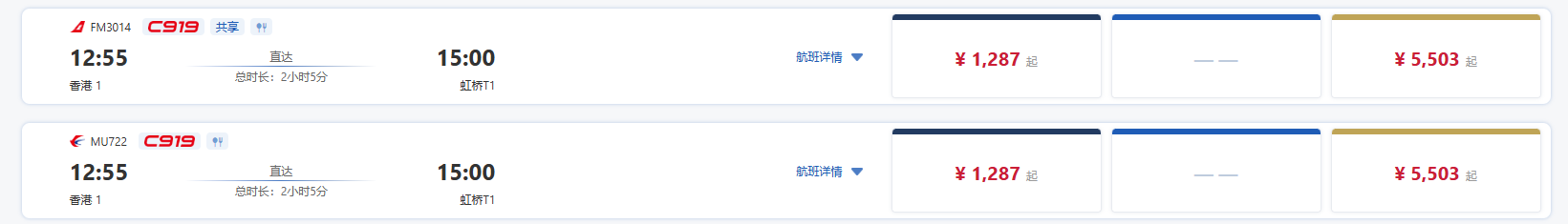 (香港中通社資料圖) 香港是東航C919定期執飛商業航班的第9座城市,“上海虹橋—香港”往返航班也是C919首次在內地以外的定期航線。香港運輸及物流局局長陳美寶早前表示,此舉反映香港作為國際航空樞紐的重要意義,並指示民航處和機場管理局為首航及之後的定航提供全面協助。 據悉,新年伊始首飛香港的C919,將以特別版“新皮膚”亮相,身披“閃耀中國紅”翱翔起航。此後C919將投入“滬港快線”定期商業航班運行,計劃每日往返一班,往返航班號分別為MU721(上海虹橋—香港)和MU722(香港—上海虹橋),有關航班早前已進入系統開啟銷售,旅客能夠在東航自有銷售渠道和各大OTA平台上,看到C919所執飛滬港航班的機型信息並購票。 香港新聞網記者今日(12月31日)查詢東航官網,發現首航當日,即2025年1月1日,上海虹橋飛香港的公務/頭等艙票價為4943元人民幣(約5260元港幣)。航班在上午8:15分起飛, 10:50分飛抵香港,航程為2小時35分。 香港飛上海虹橋方面,在首航當日,單程經濟艙票價為1287元人民幣(約1368元港幣),公務/頭等艙票價為5503元人民幣(約5856元港幣)。航班在12:55分起飛,15:00到達上海虹橋,航程為2小時05分。