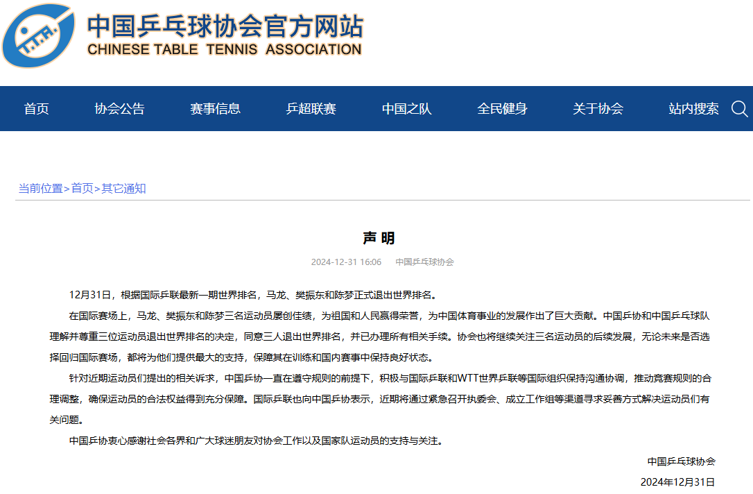 香港新聞網12月31日電 12月31日,根據國際乒聯最新一期世界排名,中國乒乓球運動員馬龍、樊振東和陳夢正式退出世界排名。中國乒乓球協會(以下簡稱“中國乒協”)在官網發佈聲明,回應社會關切。