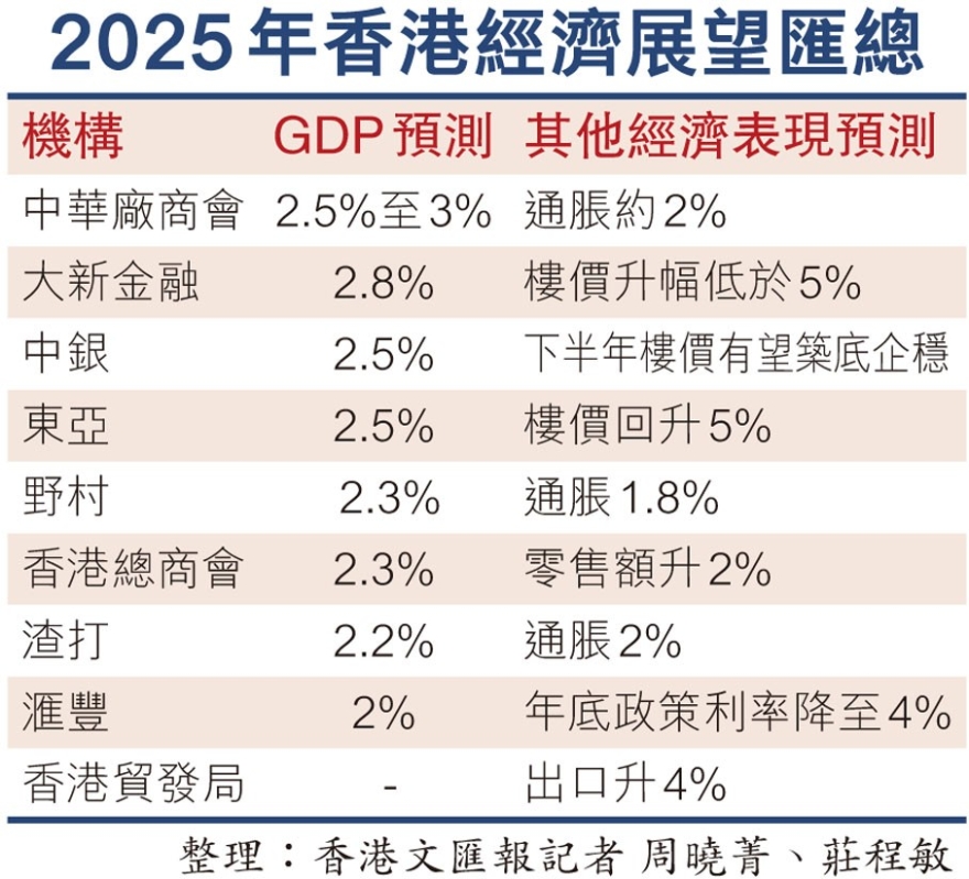 2025年香港經濟展望匯總 廠商會預計,香港經濟在2024年下半年有所放緩,該會將2024年香港GDP增長率預測輕微修訂為2.5%至3%,並預計2025年全年增長率與去年大致持平,仍能維持2.5%至3%的溫和增長。香港短期內的通貨膨脹亦保持溫和,預計2024年與2025年的消費物價變動率將穩定在2%左右的水平。 另外,香港總商會亦發表2025年展望,預計2025香港GDP增長仍有2.3%。商會在美國總統大選後一周進行調查,結果顯示26%受訪企業計劃增聘人手,近40%企業會加薪。該會主席陳瑞娟指出,調查反映企業對2025年經濟反彈抱有希望,並會拓展新市場,並對內地業務增長較為樂觀。 此外,近日各大金融機構發布2025年香港經濟展望,鑑於特朗普重掌白宮,為中美關係加添不確定性,綜合多間券商數據預測,2025年香港經濟增長介乎2%至3%,香港經濟前景有挑戰,2025年股市、樓市等仍持觀望態度。滙豐報告指,考慮到中美關係的不確定性,對外部需求更謹慎,將香港2025年GDP增長由2.7%下調至2%,2026年預測亦由2.5%下調至1.8%。 野村證券則表示,有兩個因素可能會抵消港人北上的影響,包括內地訪港遊客會在2025年以溫和的速度持續復甦,以及入境外國遊客將會持續增長,且速度會快於內地遊客。該行將2025年香港經濟預測調低至2.3%,CPI通脹維持在1.8%不變。 大新金融則預料,2025年香港經濟增長2.8%,給出較為樂觀的數據,恒生指數上半年或可上試23,100點,而17,000點關會有支持。深圳恢復“一簽多行”措施對推動零售業及吸引過夜旅客作用或有限,本地需求改善仍有待觀察。 另外,財赤問題也是擔憂之一,渣打大中華區高級經濟師劉健恆指出,今年政府財赤或超千億元,高於市場預期,為“周期性因素”。政府收入短期而言不會有大幅上升,未來數年或依然錄得赤字。他建議政府通過開源節流改善財政狀况,並增加發債用途披露,提高信息透明度。該行預測,2025年本港GDP增長將放緩至2.2%。(完) 【編輯:王少喆】