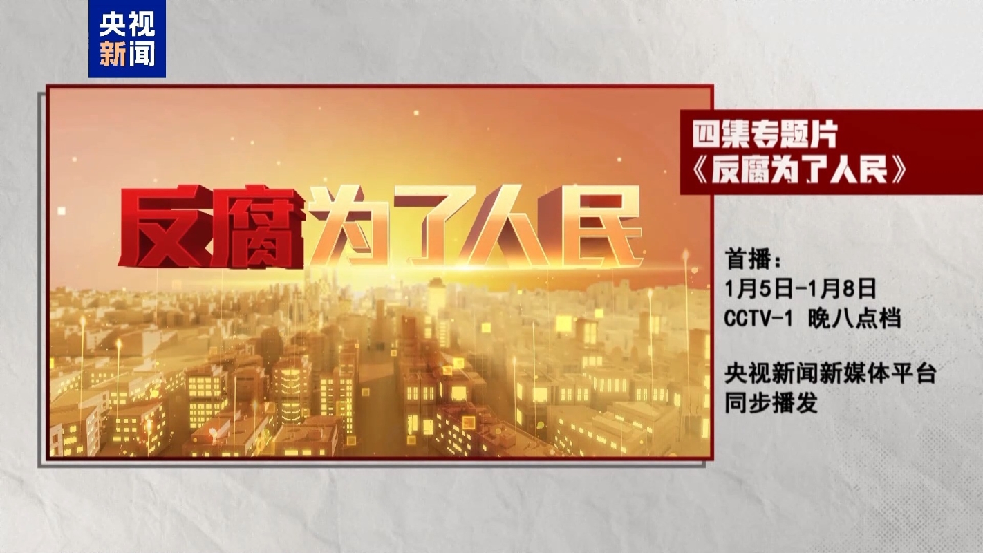 香港中通社1月4日電 據北京官媒4日消息,由中央紀委國家監委宣傳部與中央廣播電視總台聯合攝製的四集電視專題片《反腐為了人民》,將於1月5日至8日在央視綜合頻道晚8點檔播出,央視新聞新媒體平台同步播發。