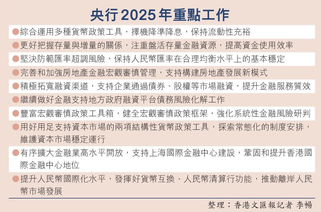 中國央行:鞏固提升香港國際金融中心地位香港新聞網1月5日電 據中國人民銀行官網消息,2025年中國人民銀行工作會議1月3日至4日召開,總結2024年工作,分析當前形勢,部署2025年工作。會議強調,要實施適度寬鬆的貨幣政策,擇機降準降息,保持流動性充裕、金融總量穩定增長。更好把握存量與增量的關係,注重盤活存量金融資源,提高資金使用效率。用好用足支持資本市場的兩項結構性貨幣政策工具,探索常態化的制度安排,維護資本市場穩定運行。 2024年,中國人民銀行持續推進金融改革開放,各項工作邁上新台階。其中,央行和香港金融管理局推出“三聯通、三便利”金融舉措,涉及金融市場互聯互通、跨境資金便利化以及深化金融合作等多個方面,深化了內地和香港的金融合作。對於2025年的工作,央行強調,將有序擴大金融業高水平開放,鞏固和提升香港國際金融中心地位,進一步增強人民幣國際貨幣功能。