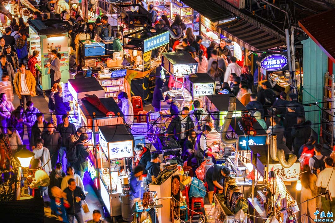 2024年1月10日晚,台灣台北饒河街觀光夜市人山人海。每逢入夜,台北饒河街觀光夜市燈火通明,攤位上琳琅滿目美食和商品吸引了不少民眾前來逛夜市消費。 (香港中通社記者 許其皓攝)