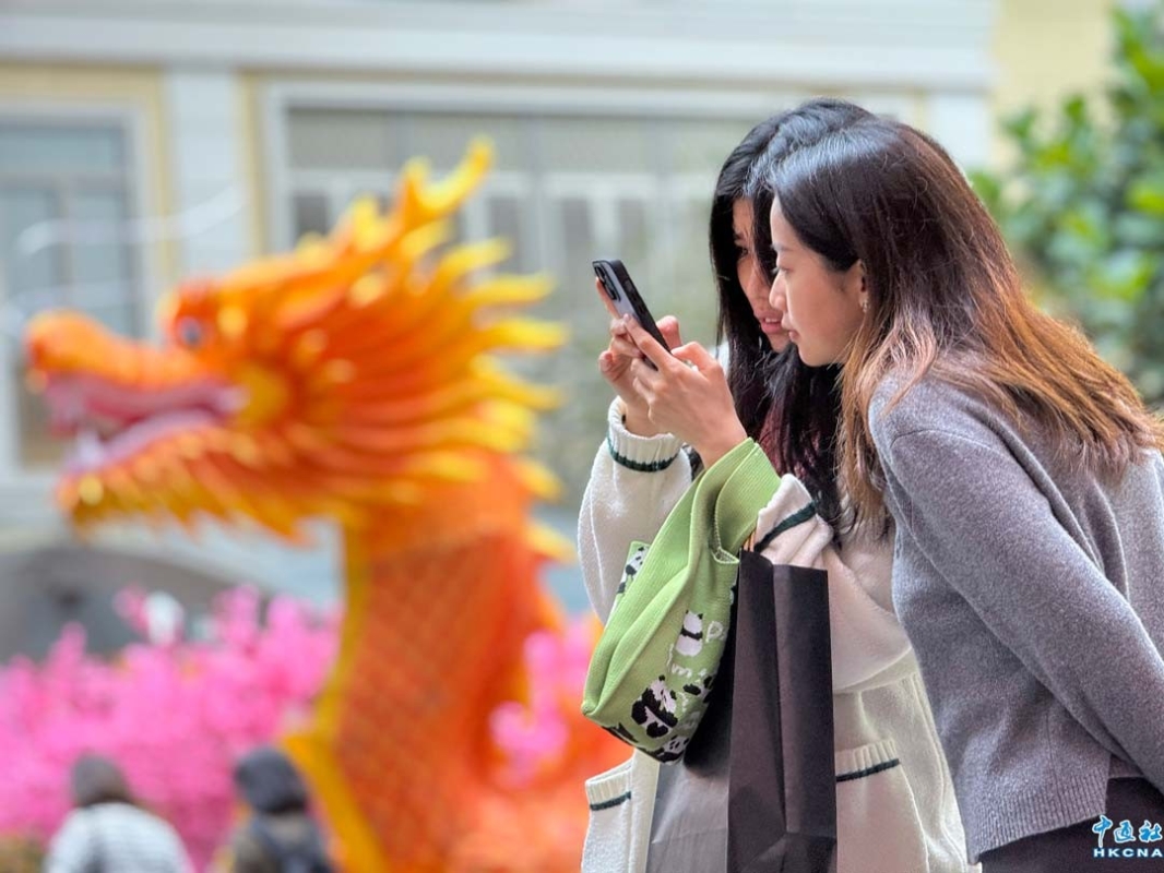 隨著龍年的到來,"龍行龘龘 前程朤朤"這句祝福潮語逐漸流行。“龘”和“朤”,分別有著獨特的寓意和內涵。“龘”讀音為dá,它的形象代表了龍的三倍疊加,形容龍飛翔時迅速而強勁的樣子,象徵著力量和速度。“朤”讀音為lǎng,由四個“月”組成,代表光明、清晰,常被用來描繪前途的光明、廣闊和輝煌。為迎接龍年,香港街頭處處充滿龍元素,寓意新的一年龍耀吉慶。圖為市民途經灣仔利東街。 (香港中通社記者 徐文峰攝)