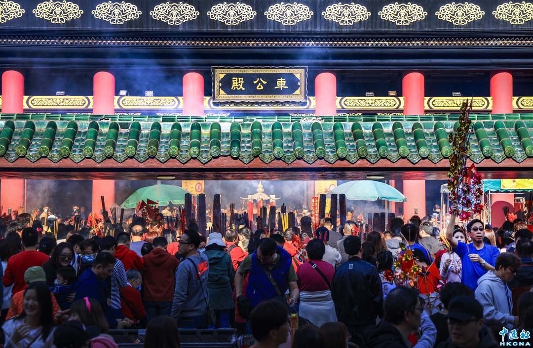 2024年2月11日農曆大年初二車公誕,香港車公廟人山人海,香火旺盛,大批善信上香祈福,轉風車,祈求新一年平安順利。 (香港中通社記者 許其皓攝)