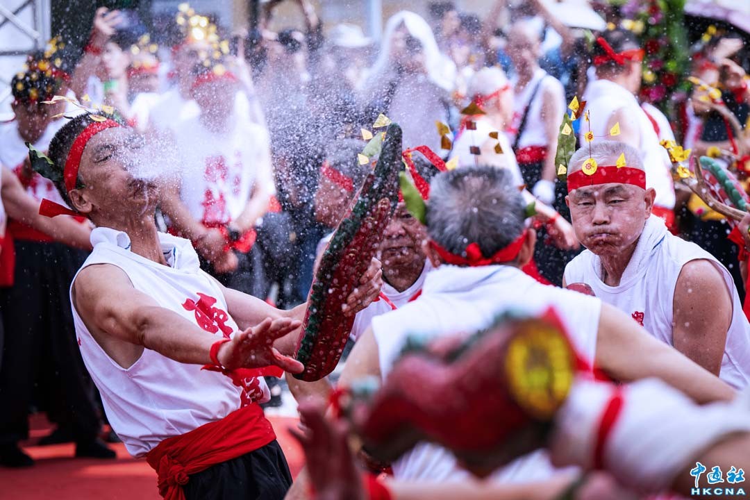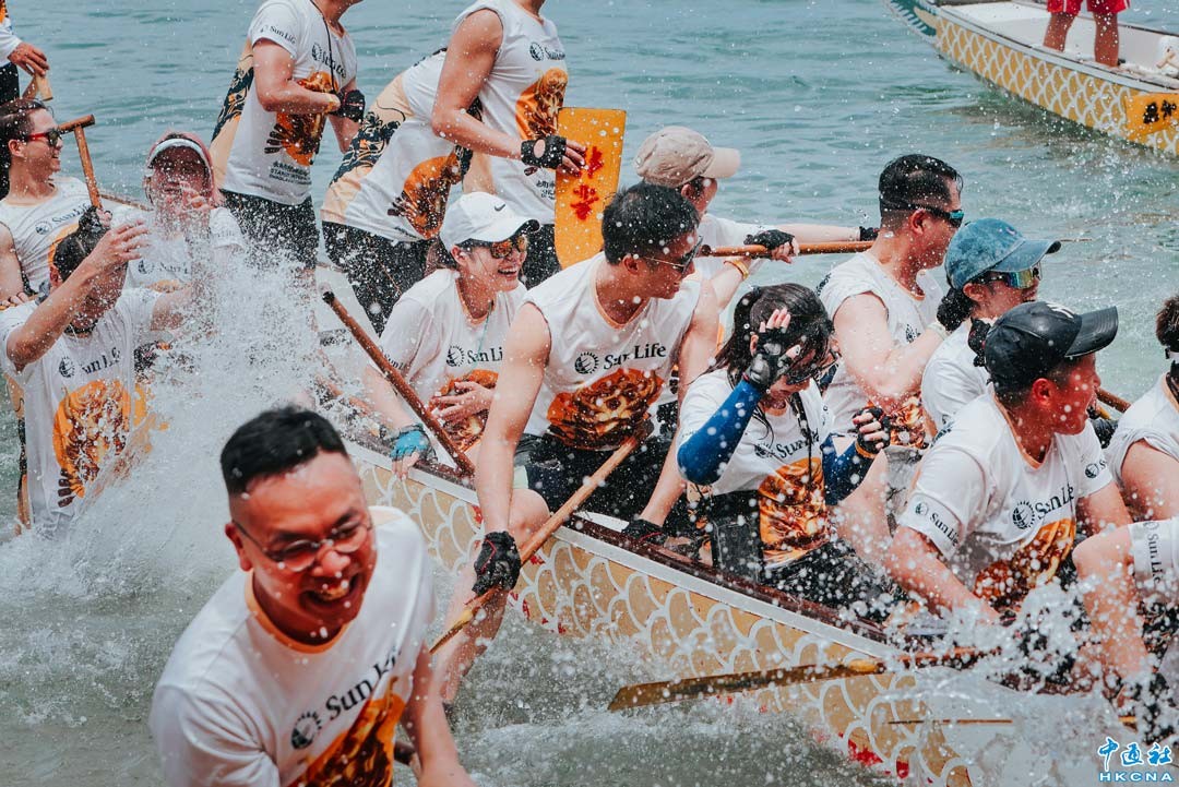 2024年6月10日是端午節,香港多區設有龍舟比賽,赤柱舉辦的“國際龍舟錦標賽” 10日上午拉開帷幕,參賽人數最多,約有190個隊伍、約3800人參加,設有公開組、混合組、女子組等組別,現場氣氛熱烈,龍頭擊鼓聲此起彼落。圖為健兒潑水慶祝。(香港中通社記者 謝光磊攝)