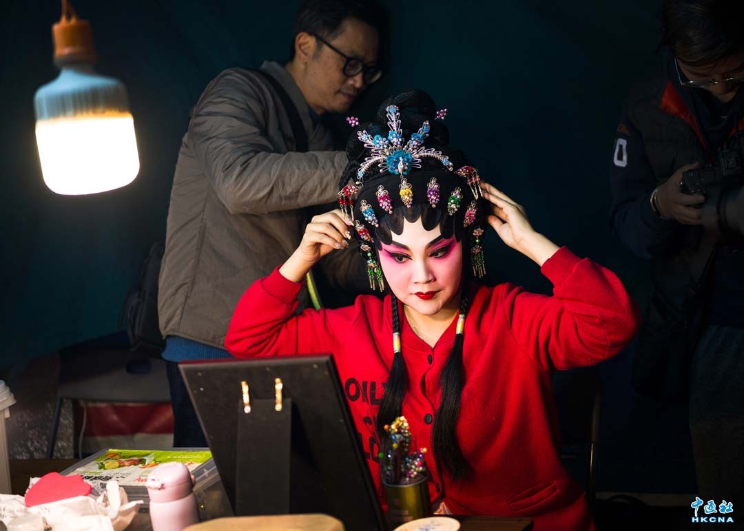 2024年3月9日,演員在後台化妝。當日,二零二四甲辰年澳門雀仔園賀土地誕系列活動之賀誕粵劇神功戲首場開鑼,由江門市新會區青年粵劇團擔綱演出“南唐李後主”,免費接待市民、街坊觀賞。香港中通社圖片