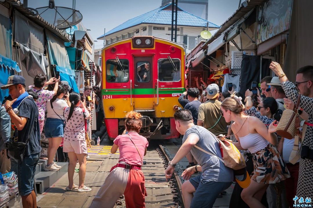 美功菜市場位於泰國首都西南,距離曼谷80公里的夜功府。每天有多列火車從菜市場上通過,被遊客稱為世界上最危險的菜市場。每當列車從遠方馳來時,沿著鐵軌買賣的攤販們就會迅速將攤位往後挪,或暫時回收遮陽篷,隨著火車緊貼著各種水果、蔬菜等攤位駛過,攤販們馬上又恢復營業,繼續招呼顧客吆喝買賣,直到下一趟火車開來。美功菜市場每天有8列火車經過,但開行多年來,從未出現過交通事故。(香港中通社記者 謝光磊攝)