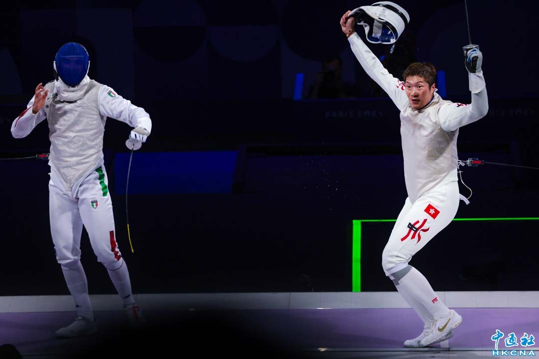 當地時間2024年7月29日,張家朗拿下最後一分後,摘下面罩慶祝。當日,在巴黎奧運會擊劍項目男子個人花劍決賽中,中國香港選手張家朗15比14戰勝意大利選手菲利波·馬基,奪得冠軍。這是中國香港隊本屆奧運會的第二金。(香港中通社記者 謝光磊攝)